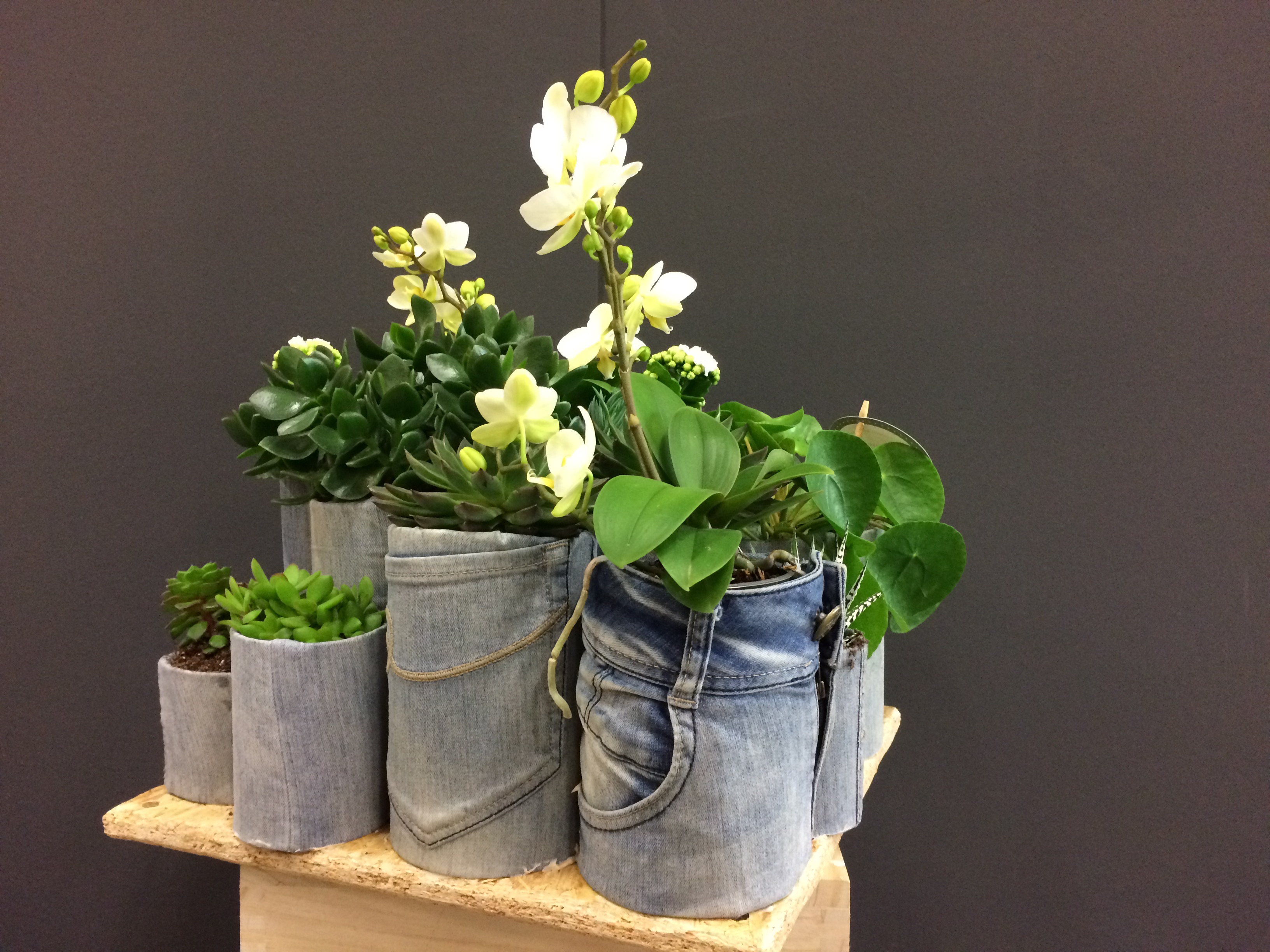 Denim Drift color of the year 2017 - A great color and theme to use in your work with plants. Nelleke Bontje showed during her demonstration at seasonal trade fair, how to translate this color in plant arrangements. Using old denim jeans she made three compositions. This is the most high-end arrangement with 12 tubes of different sizes all wilted with plants in the same style range.