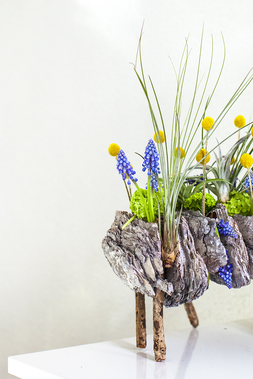 Muscari, craspedia, viburnum and tillandsia, nested in a structure made from bark for a real Easter feel.