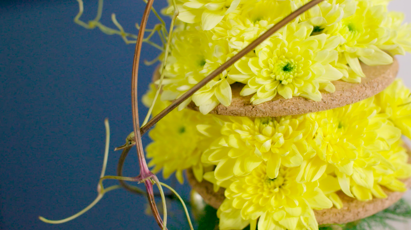 How to make an original Easter bouquet? Chantal Vollenbroek shows you her idea for a fun, egg shaped, parallel Easter bouquet. She uses two shades of yellow Chrysanthemums; the 'Baltica Cream' and 'Baltica Yellow'. Together with Asparagus, cork coasters and some golden details it's a design that will pleasantly surprise your customer!