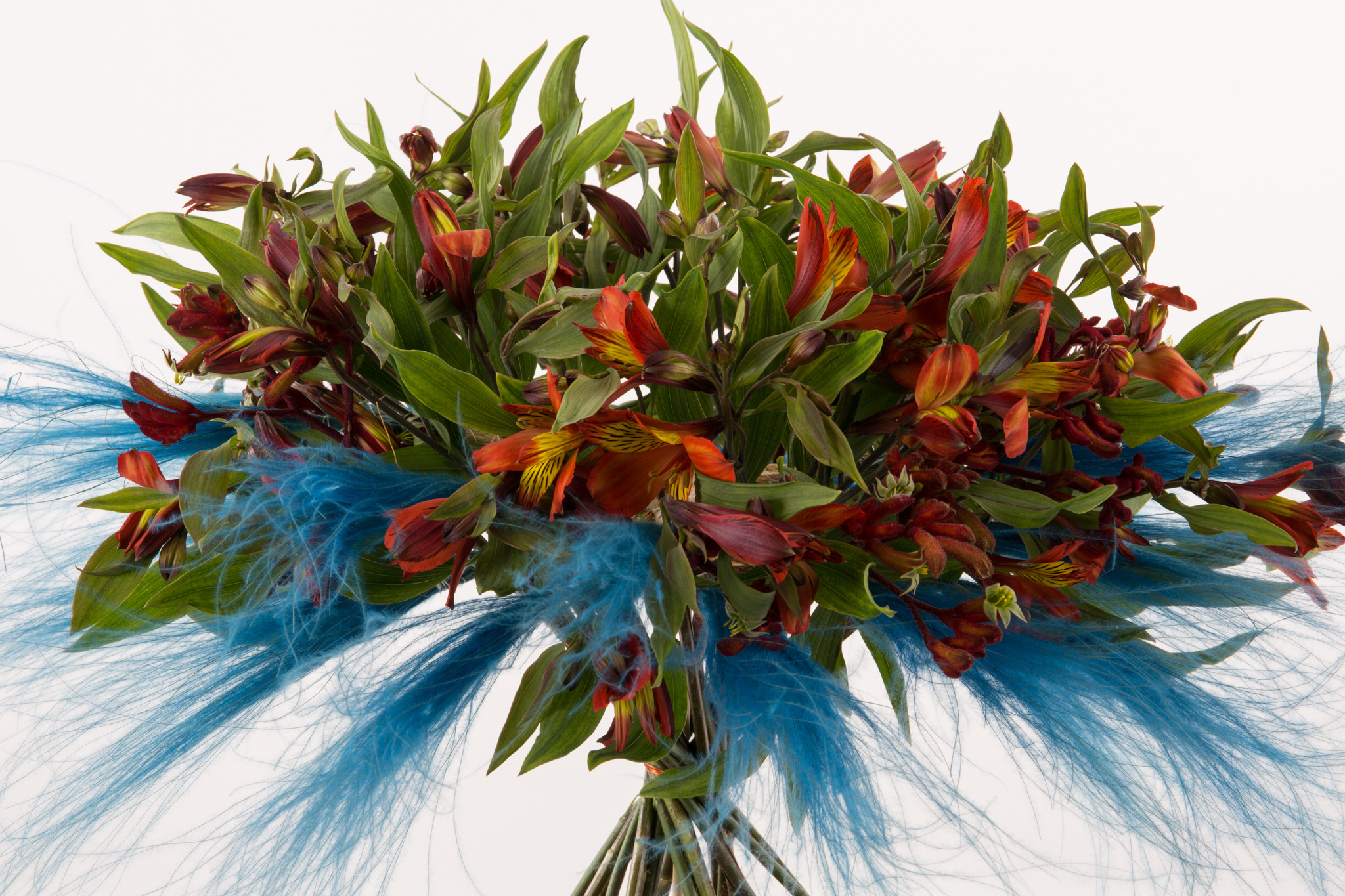 Roos van Unen has created an edgy bouquet with the beautiful Alstroemeria 'Hiphop' in which the bright orange colour is being accentuated by the dyed blue grass plumes. A wooden circle is placed in the middle and the plumes are glued to it. Afterwards, the Alstroemeria and the Kangaroo paw (Anigozanthos) with a matching colour are placed between the plumes and are bound as a spiral bouquet. The bouquet is placed in a nice deep bowl to create an even more edgy effect.
