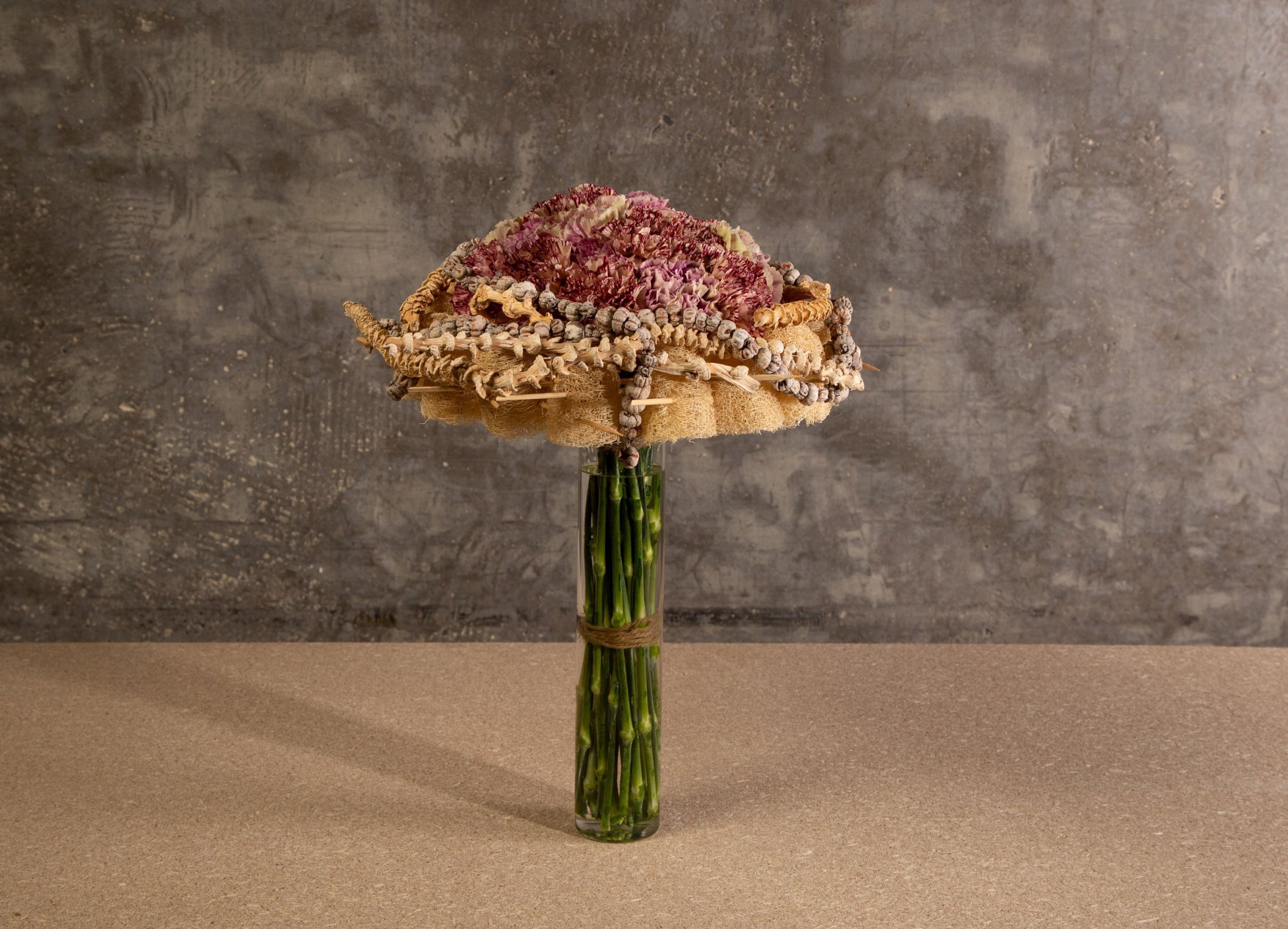 In this contemporary carnation bouquet, Pim van den Akker used various Dianthus varieties in pink and salmon shades. The colours of the Trendy Dianthus look wonderful with cream-coloured materials. The frame is made of luffa's which are connected with sticks. The stems of the carnations are kept long for an elegant look. As a finishing touch, details are added like a string with dried fruits.