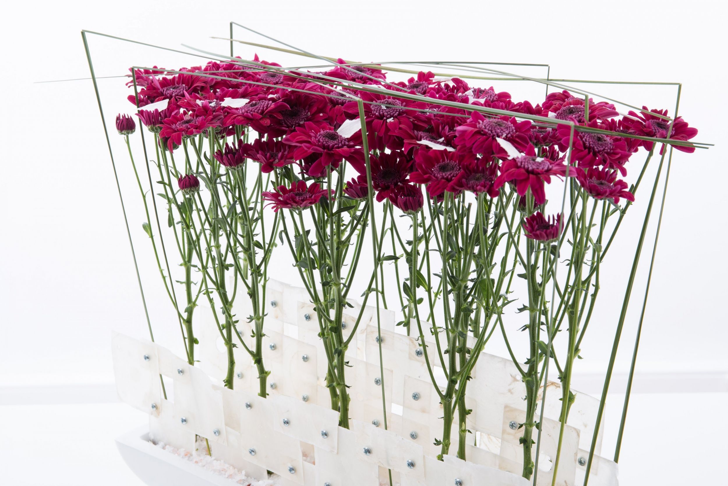 Pim van den Akker has created an interesting design with the Chrysanthemum Chrysant 'Stresa Purple' from Zentoo. This purple beauty is presented on its tall stems in a long white container filled with floral foam and topped up with coarse sea salt. The white combined with the deep purple colour of the Chrysanthemum 'Stresa Purple' creates a peaceful, fresh and elegant piece in which all attention is drawn to the flower. Some elements are added such as the folded steel grass which creates some sort of frame. It is perfectly combined with the oyster shells which have been cut into squares and attached to each other with screws. Pieces of oyster shells are placed on top of the flowers to link the top of the design with the bottom. Simply elegant!