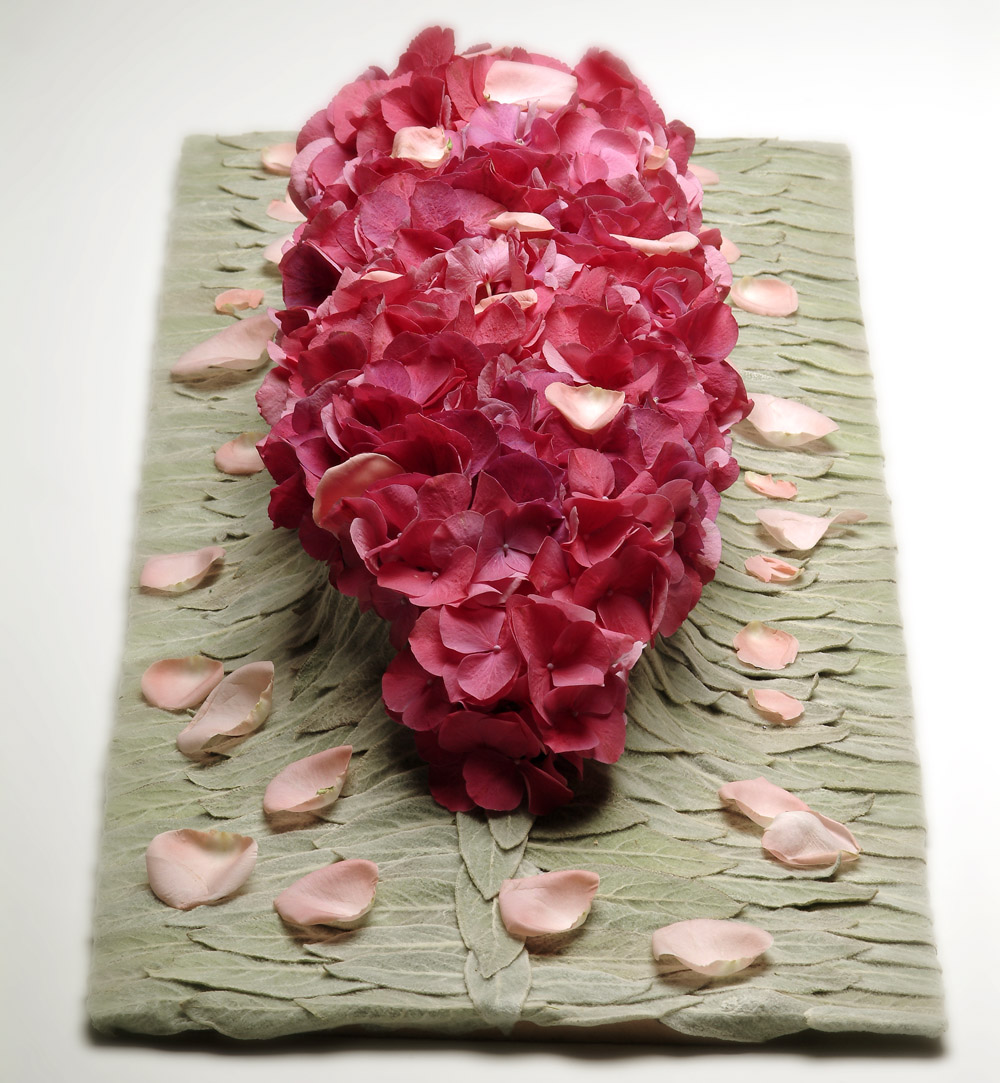 A rich and full arrangement from which Hydrangea and rose leaves seem to burst.