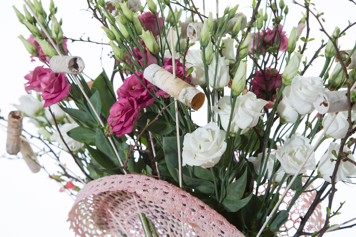 Pim made this fan shaped flower bouquet with lisianthus. He folded an already made frame into a fan. Connected some sticks and the new base of this bouquet was ready. Some other details are rolled paper on sticks, combined with some blossom branches and you have a great bouquet!