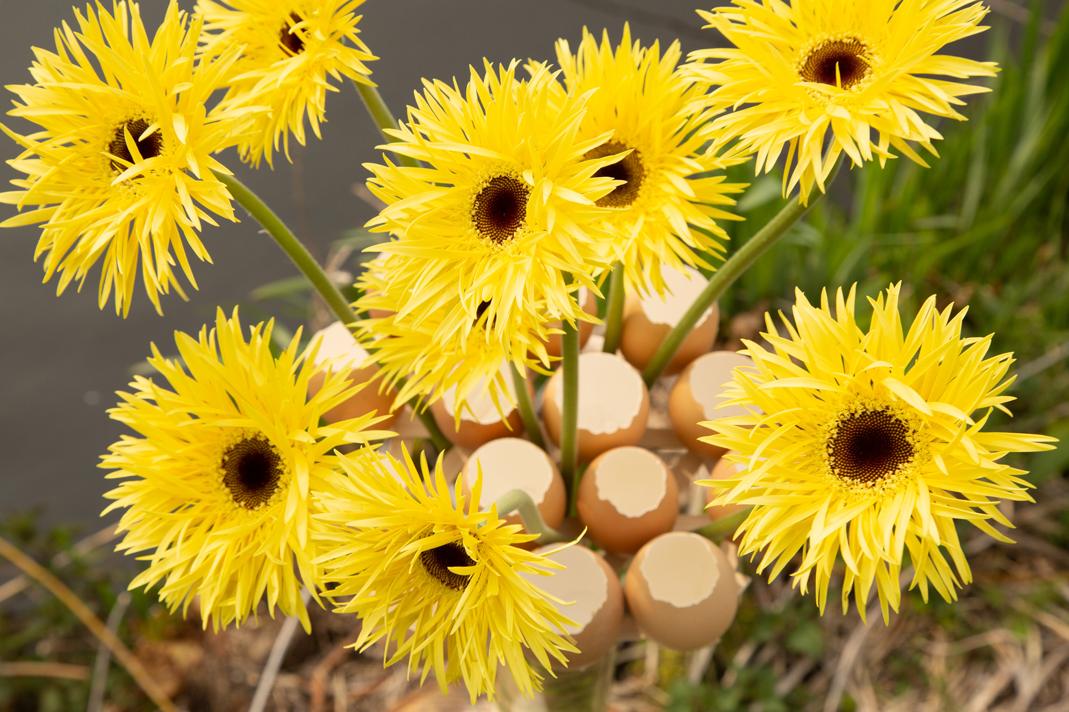 These bright yellow mini Gerberas from LG Flowers bring out the sun immediately! It's the 'Mi Punki Indy' which Pim van den Akker has placed in a simple frame made from egg shells. Curious to see how he created this cute little bunch? Watch the livestream on our Facebook page!