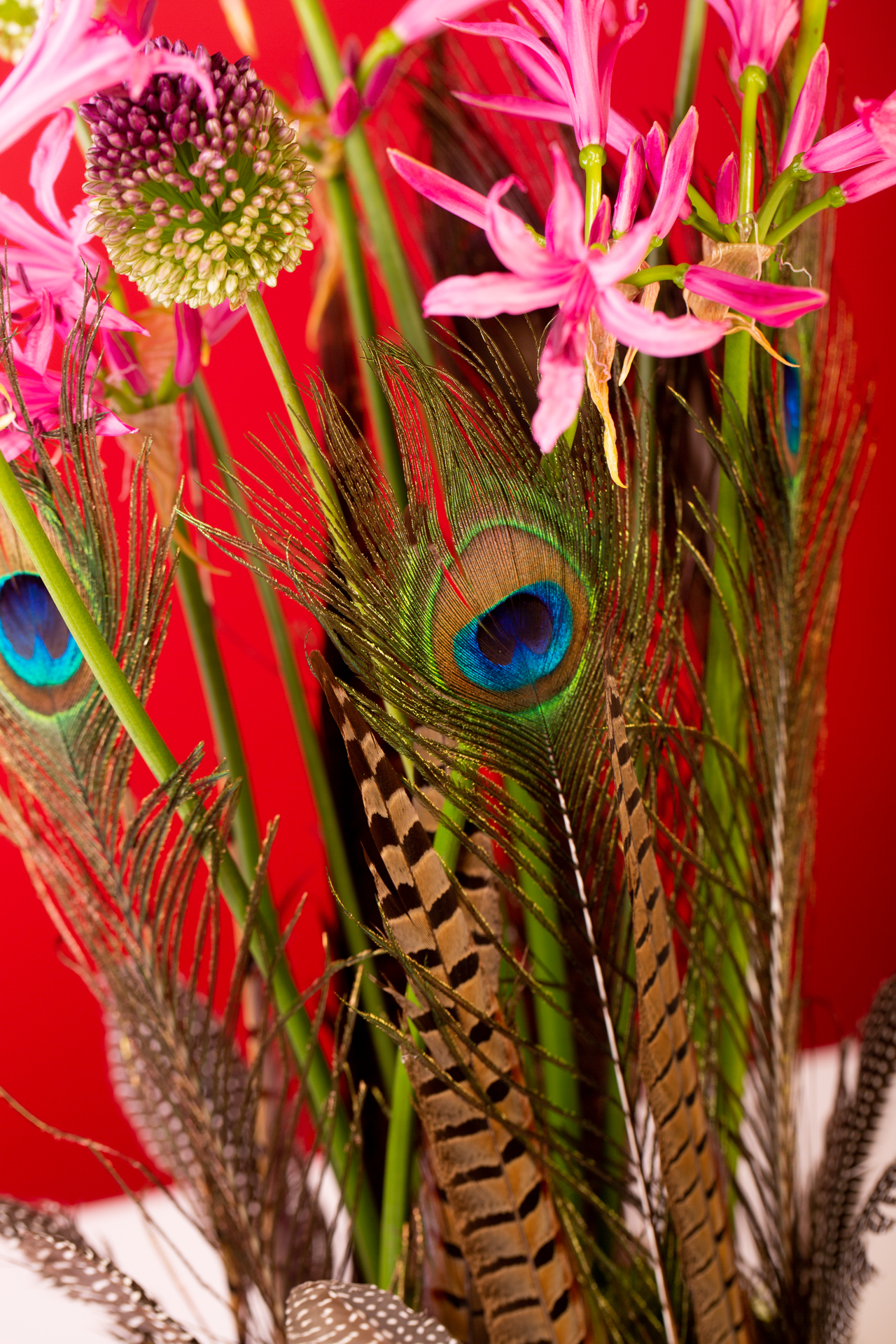 Let's brighten up the grey autumn skies with colourful autumn floral design! Pim van den Akker showed several autumn flower arrangements with ready-made products from Dillewijn Zwapak during his livestream on Facebook. One of these example is this tray, decorated with feathers. He used a piece of floral foam and covered it with grinded moss. With just a few Nerines it is a colourful piece!