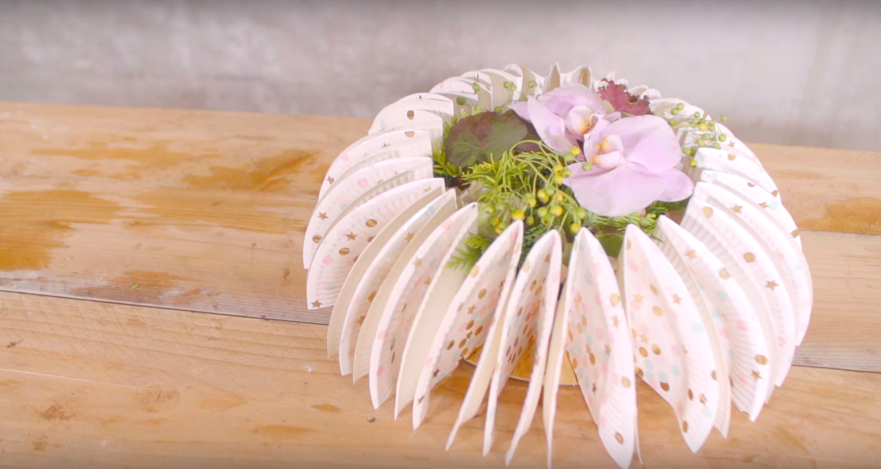 Floral designer Bea Beroy likes to use modest materials in a surprising way in her flower arrangements. A good example is this festive flower arrangement: the base is created by glueing folded paper plates on an Oasis container. Nice effect, right? And it draws your attention towards the center that features the beautiful 'Manila' cut Phalaenopsis. Bea will show just how to create this design!