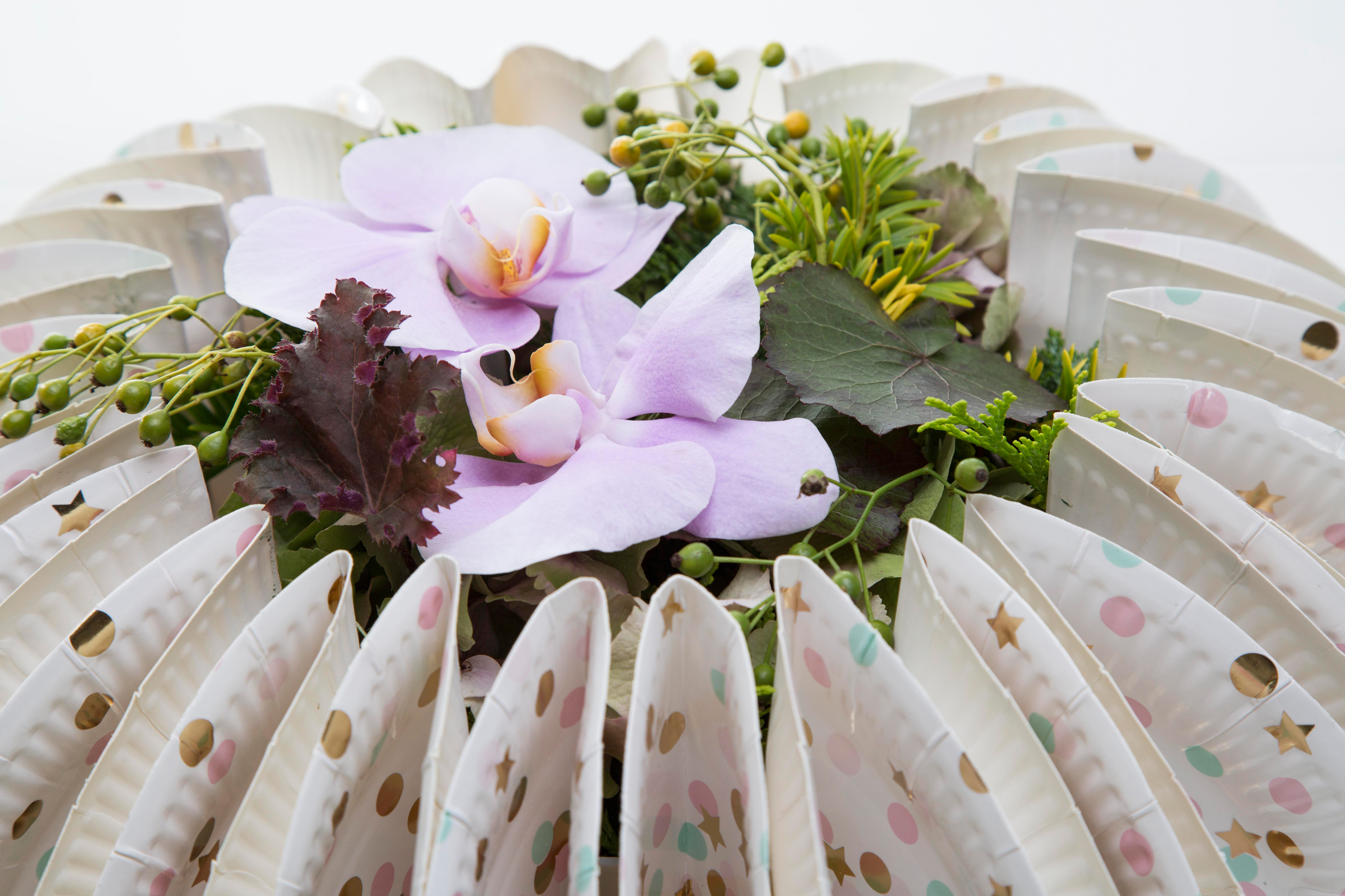 Floral designer Bea Beroy likes to use modest materials in a surprising way in her flower arrangements. A good example is this festive flower arrangement: the base is created by glueing folded paper plates on an Oasis container. Nice effect, right? In this How to Make video she shows you just how to create this design!