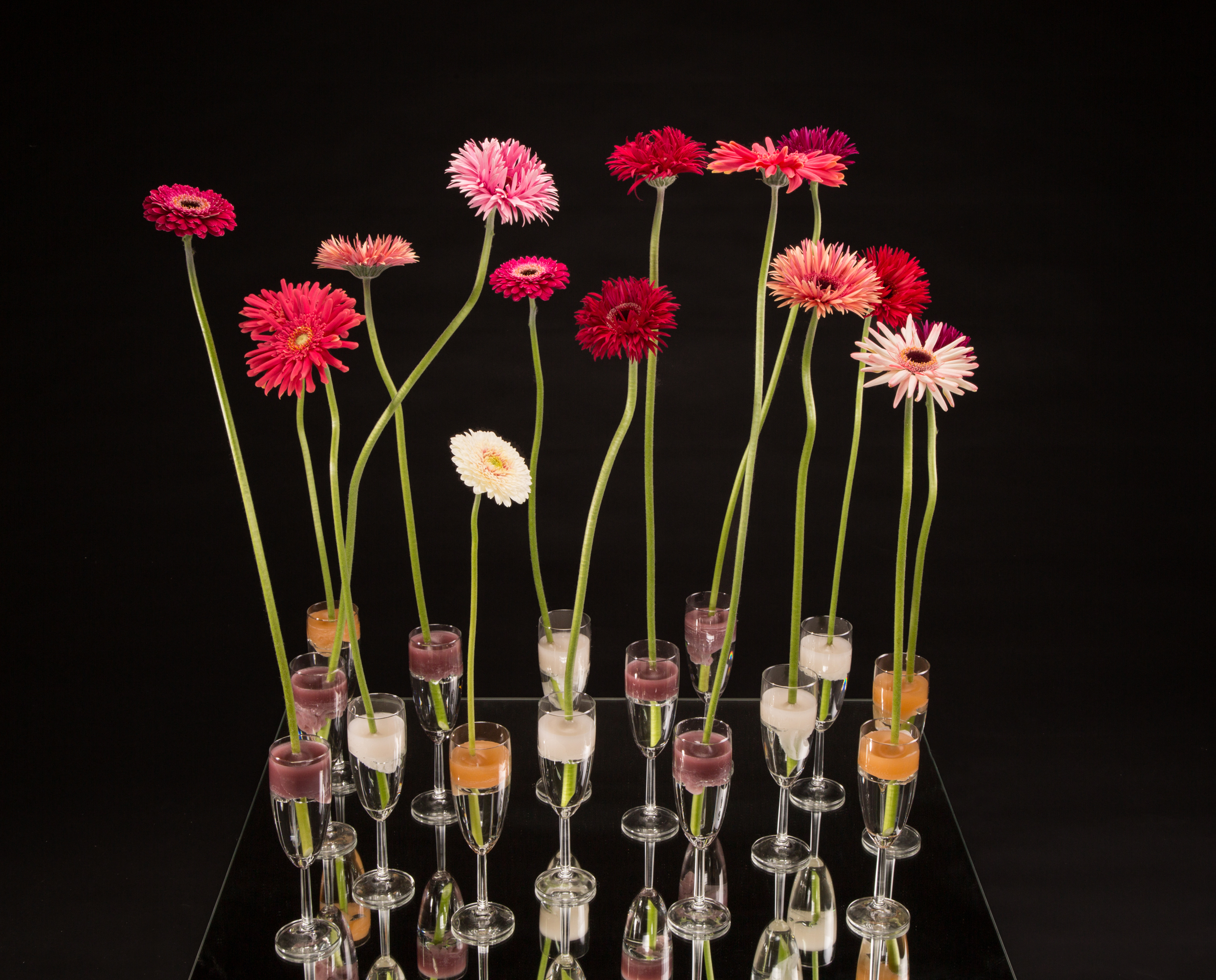 Mini Gerberas in champagne glasses as a festive table decoration during Christmas! An idea in which the fun mini Gerberas in all kinds of colours and shapes from LG Flowers are placed in the spotlight. A real eyecatcher in your shop window, on the dinner table during Christmas or anywhere you would put them. How to make it? By putting water in the glasses, placing a mini Gerbera in them and holding it and pouring some liquid candle wax in the glasses. Beware: heat the candle wax and let it cool off until it is still easy to pour. Also a nice idea for New Year's! Cheers!