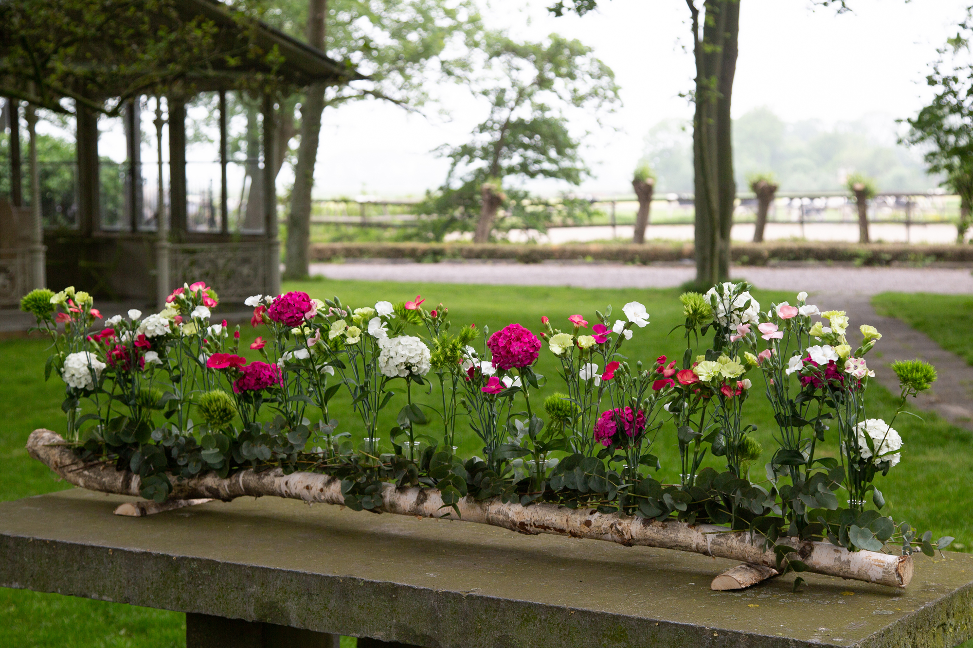 Example of a festive table decoration by Dennis Lanzaat. He used a long birch branch as a base and drilled holes the size of glass tubes. He filled them with different varieties of the Sparkz collection, like the Sparkz Green Trick and the Solomio® varieties 'Cas' and 'Boyd' and 'Lord' Breanthus. Eucalayptus is woven in between the glass tubes.