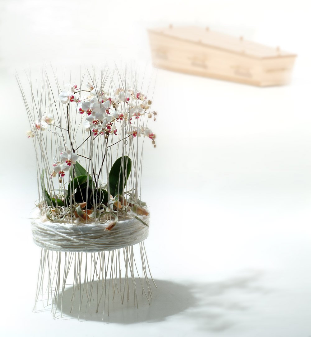 A slender, almost floating arrangement, given that appearance by the bleached branches and white orchids, the greenery providing support.