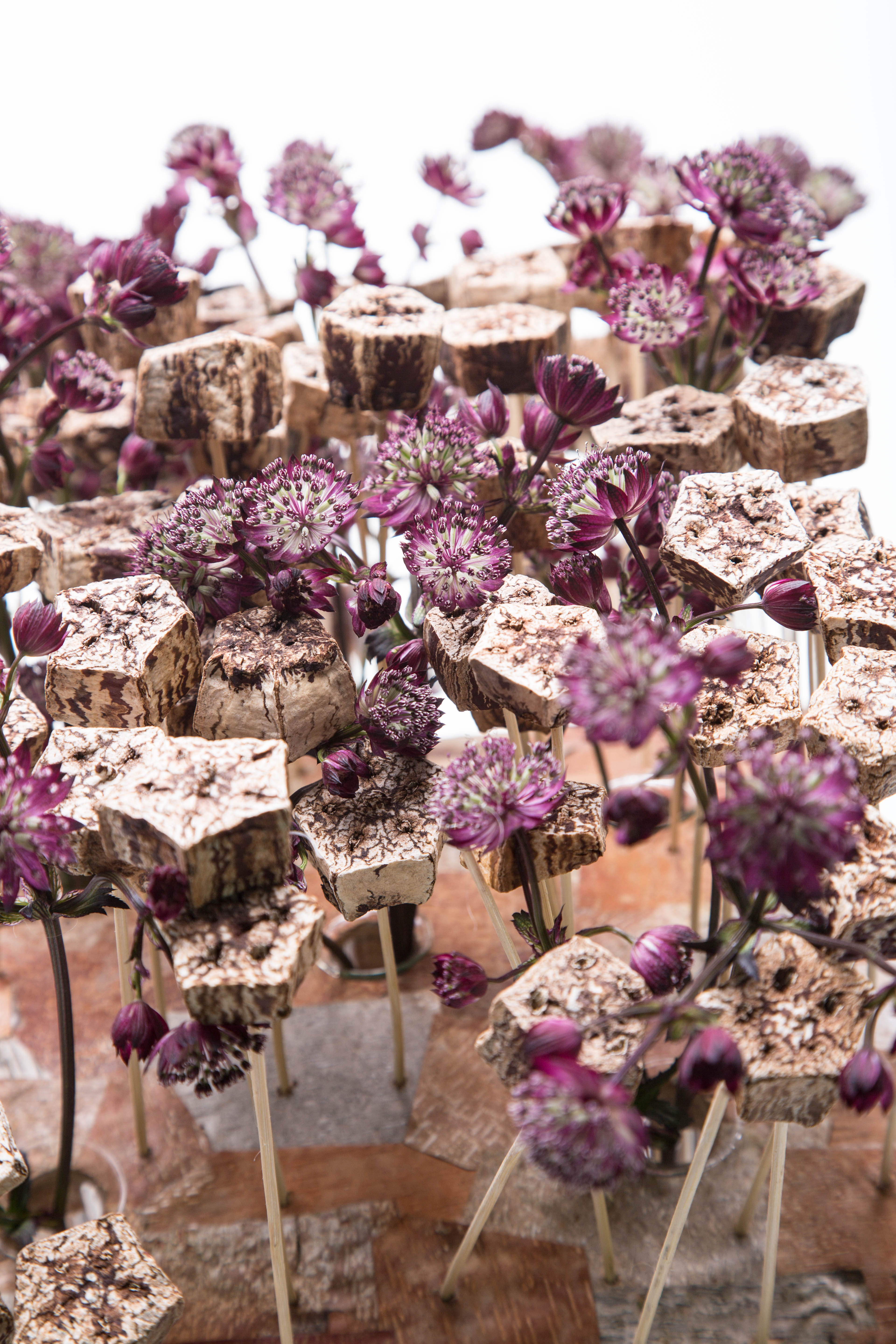 Een inspirerende houten vorm is bekleed met berkenbast! en voorzien van glazen buisjes.