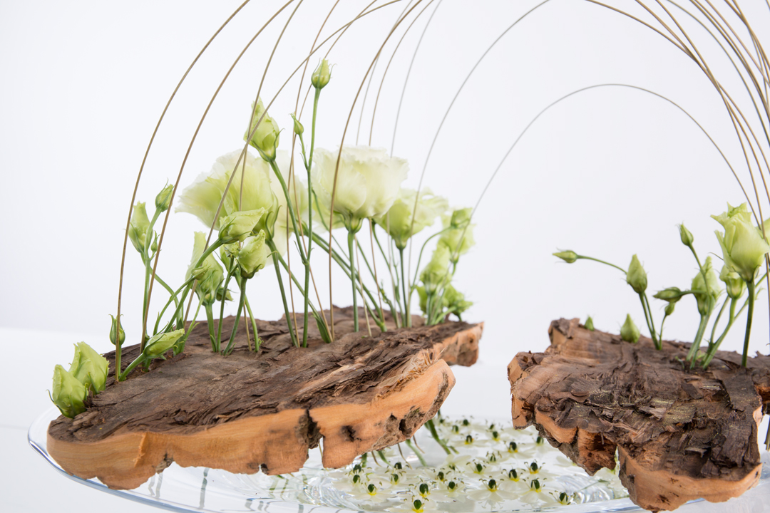 Exciting flower arrangement with Lisianthus. The arch over the water, the white flowers, the wooden base and the floating little Ornithogalum flowers give this design by Roos van Unen an enchanting atmosphere.