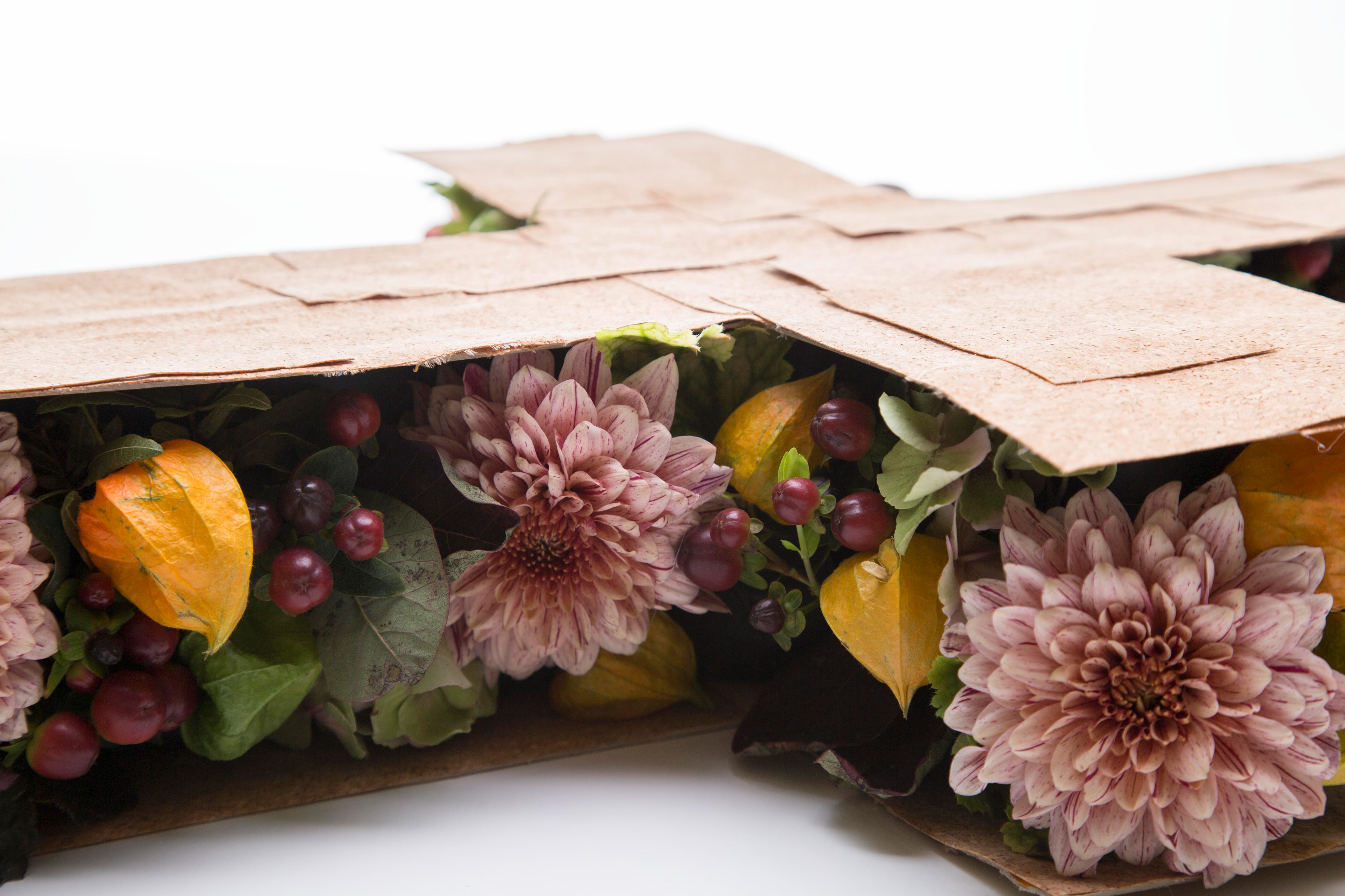 A classic shape but with modern materials and colour combinations a contemporary design. Bea Beroy created this flower cross with cork and 'filled' it with 'Pip Salmon' Chrysanthemums, Hypericum berries, Hydrangea and Physalis. The video in which she shows you how to make this funeral design will be published soon!