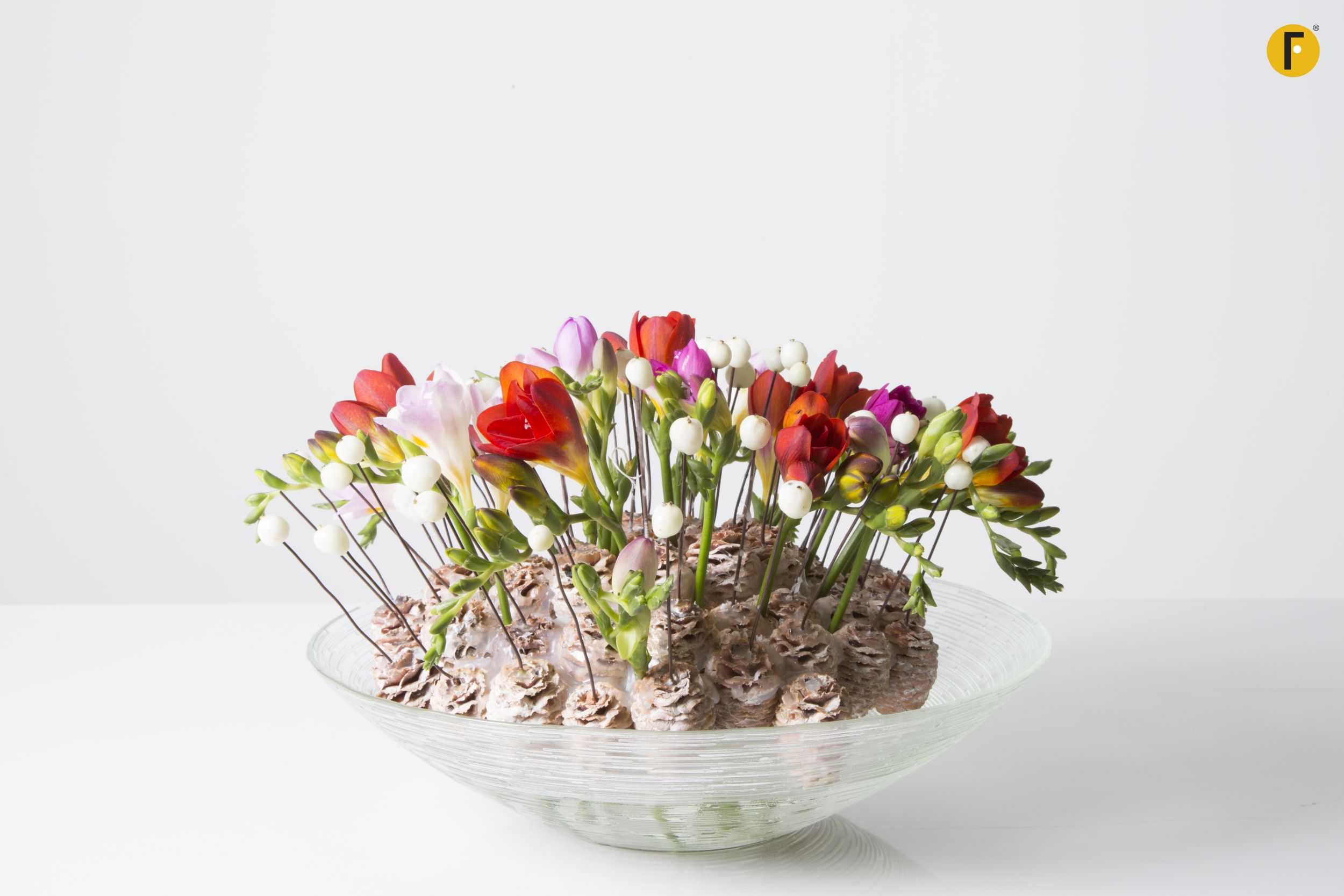 Roos van Unen glued together some pine cones to serve as a base for this arrangement. For a nice winter feel, she poured some melted candle wax onto them. The colorful freesias are placed in between the gaps and Roos finished it of with some Symphoricarpos berries on pins.