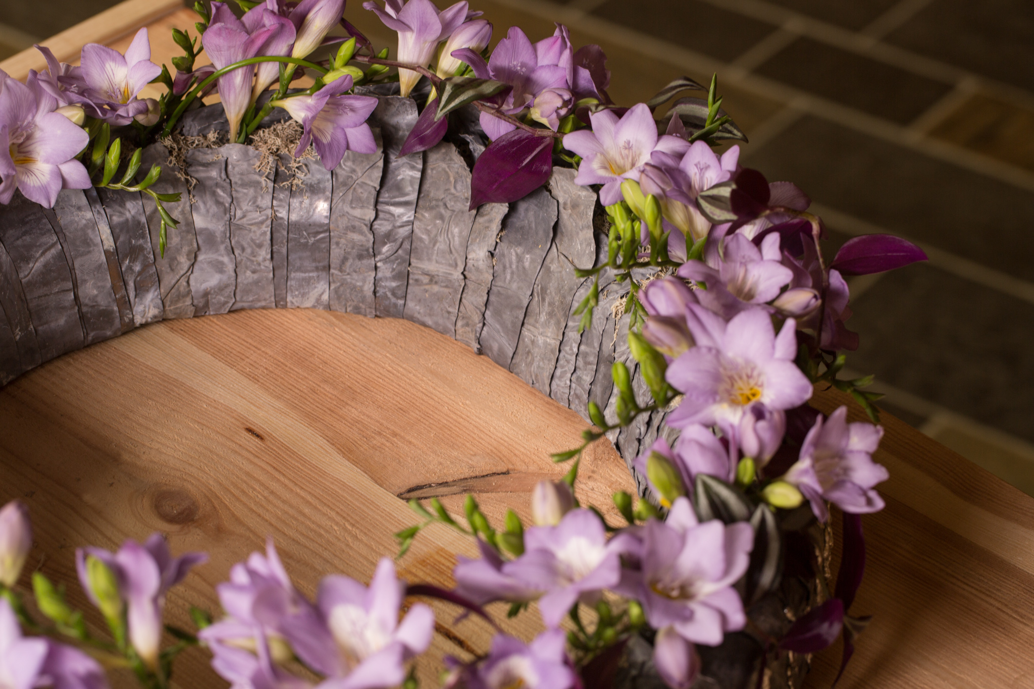 The Freesia is a flower that has an emotional meaning to a lot op people. No wonder it is often used in funeral flower arrangements. Roos van Unen created this beautiful wreath with purple freesia and leaves of the tradescantia. The OASIS ring is covered with strips of lead.