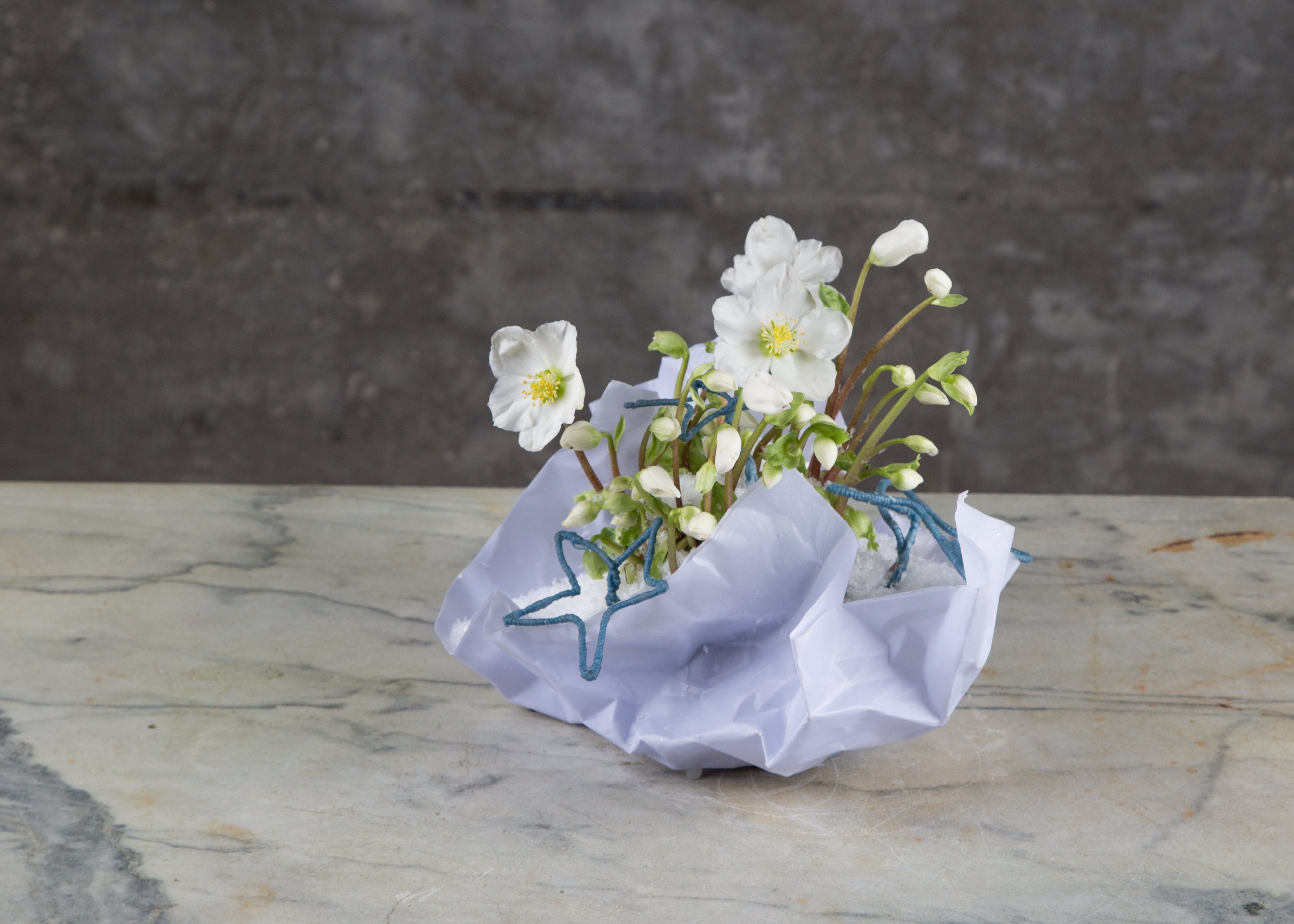 Fun and quick planter for Hellebores: melt left overs of white candles and drop in an A4 piece of paper so it is totally covered. Shaped the paper into a bowl while it is still warm. Be careful not to crack the wax layer because then it won't be watertight. Place in a beautiful white Hellebore and add some details. Cute design!
