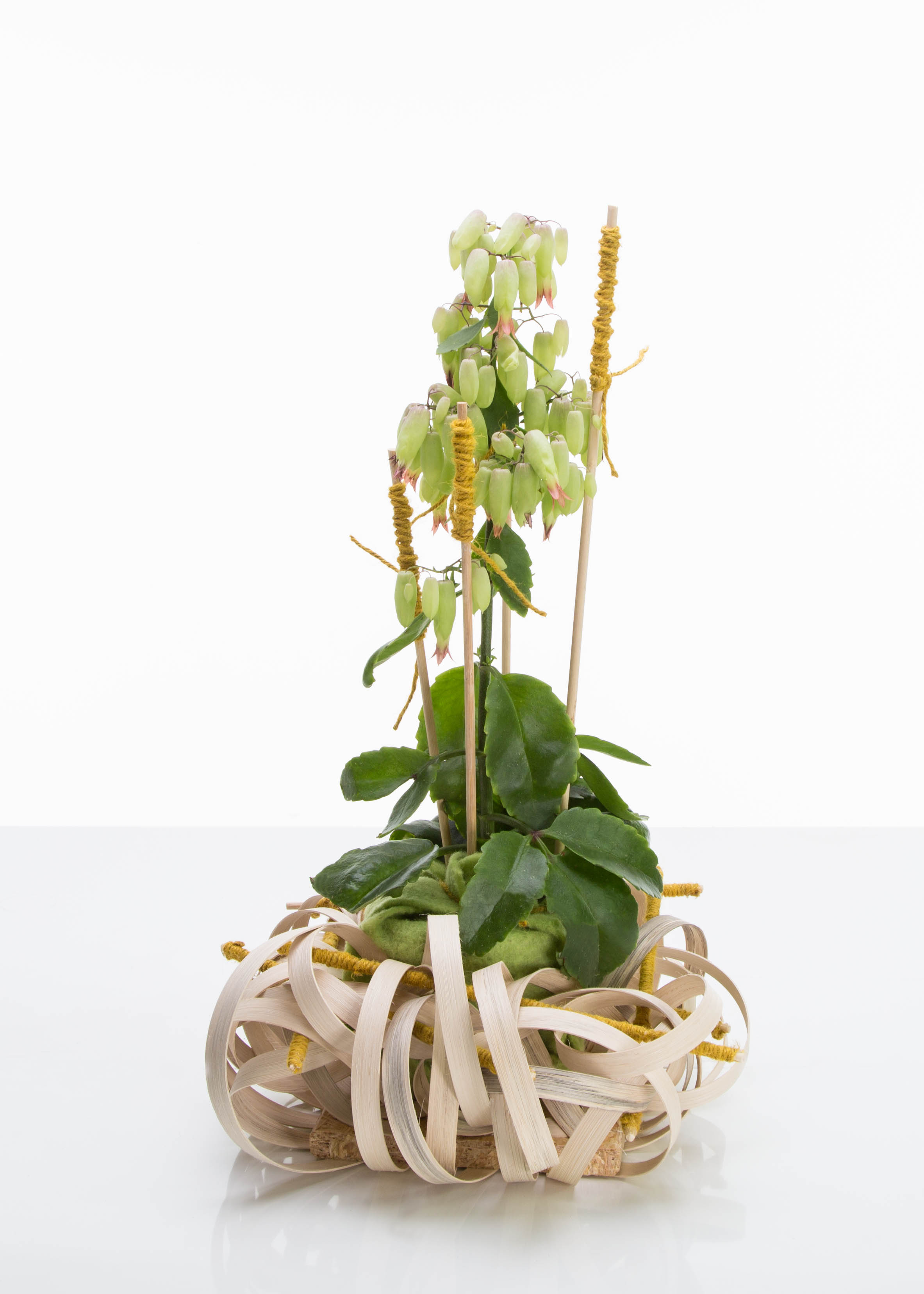 The Kalanchoë 'Bell' is a real eye-catcher! David Ragg gives this great plant a little extra by creating a container with veneer. He also placed some sticks with yellow wool around it, as a nice detail.
