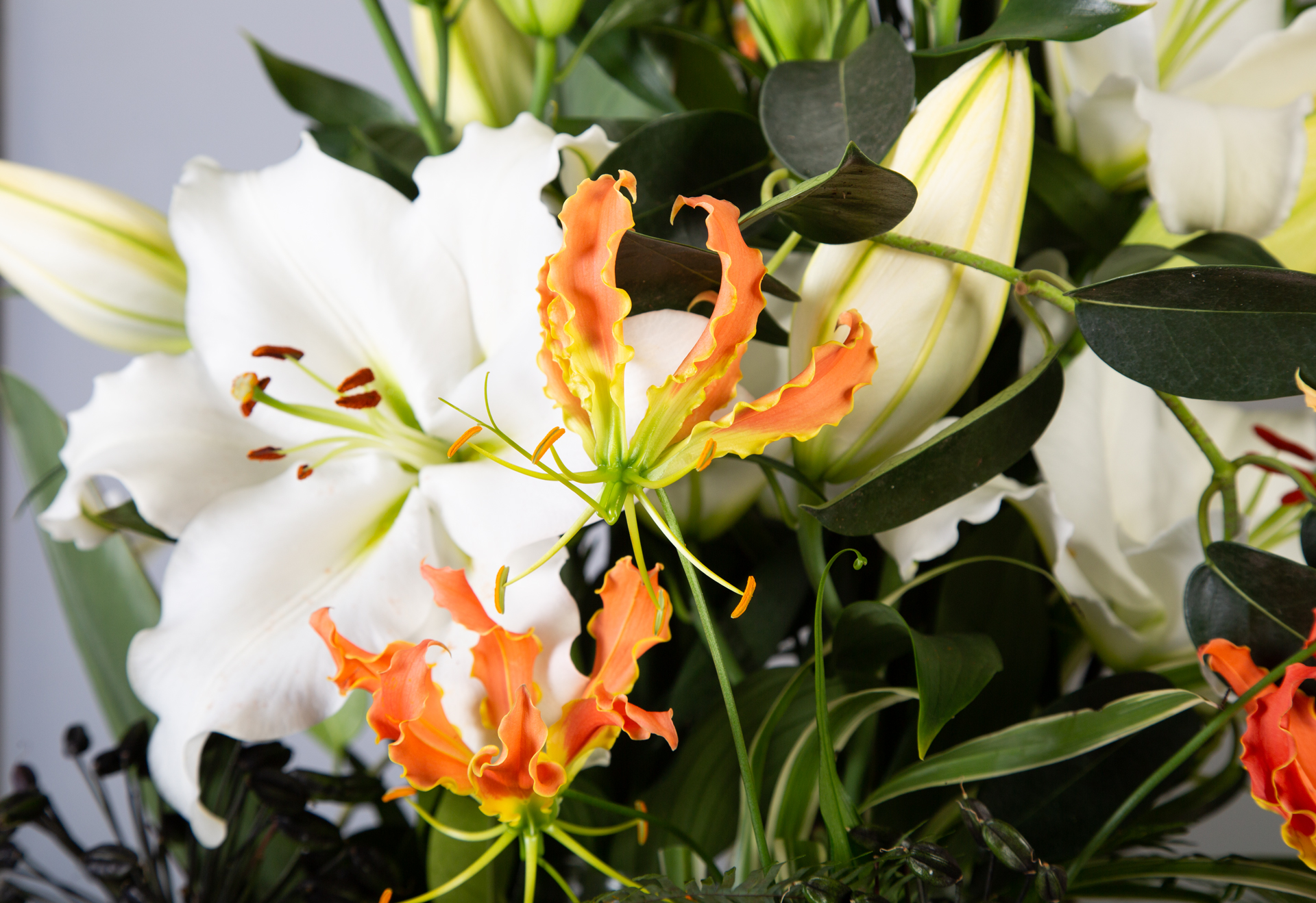 The wonderful white and odourless 'Tourega' lily from Royal Van Zanten shines as the centre of attention in this jungle arrangement by Dennis Lanzaat. A unique design in which he combines the serene white 'Tourega' lilies, various foliage and even plants as hydroponics. This large-headed oriental lily is the only one of its kind to be odourless, making it a perfect choice in arrangements for cafés, hotels and restaurants.
