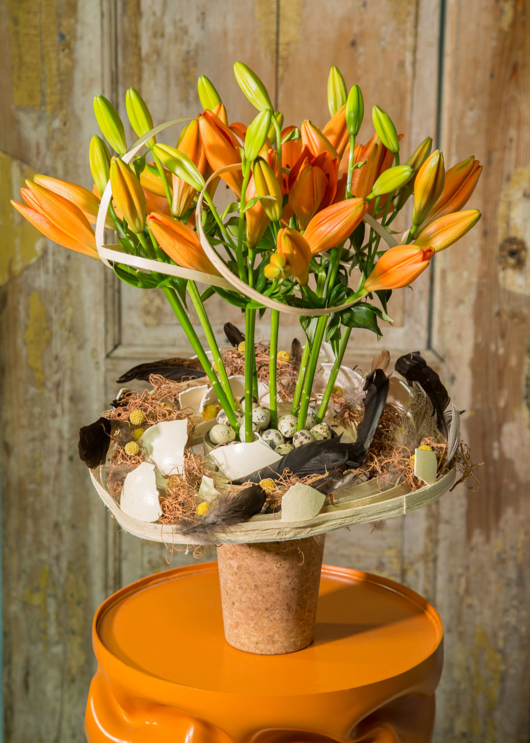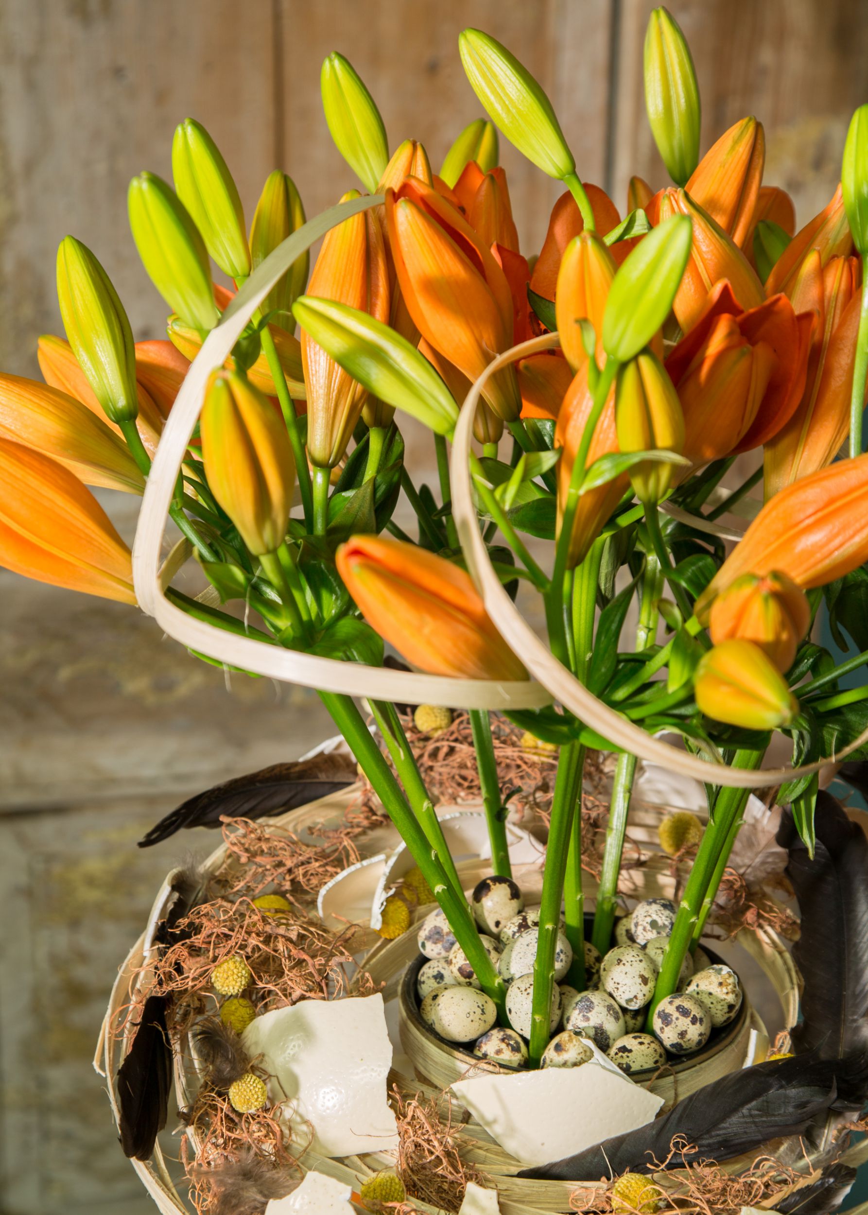 Using orange can work well in your Easter arrangements. When the orange Sunderland lily from Royal van Zanten Flowerbulbs opens up, it will steal the show! If you incorporate these strong lilies with their bright colour, you will make an impact. Also, these Sunderland lilies don't have a fragrance. It is nice to use such an eye-catching colour in Easter arrangements. Add some Easter details like eggshells to make it complete.
