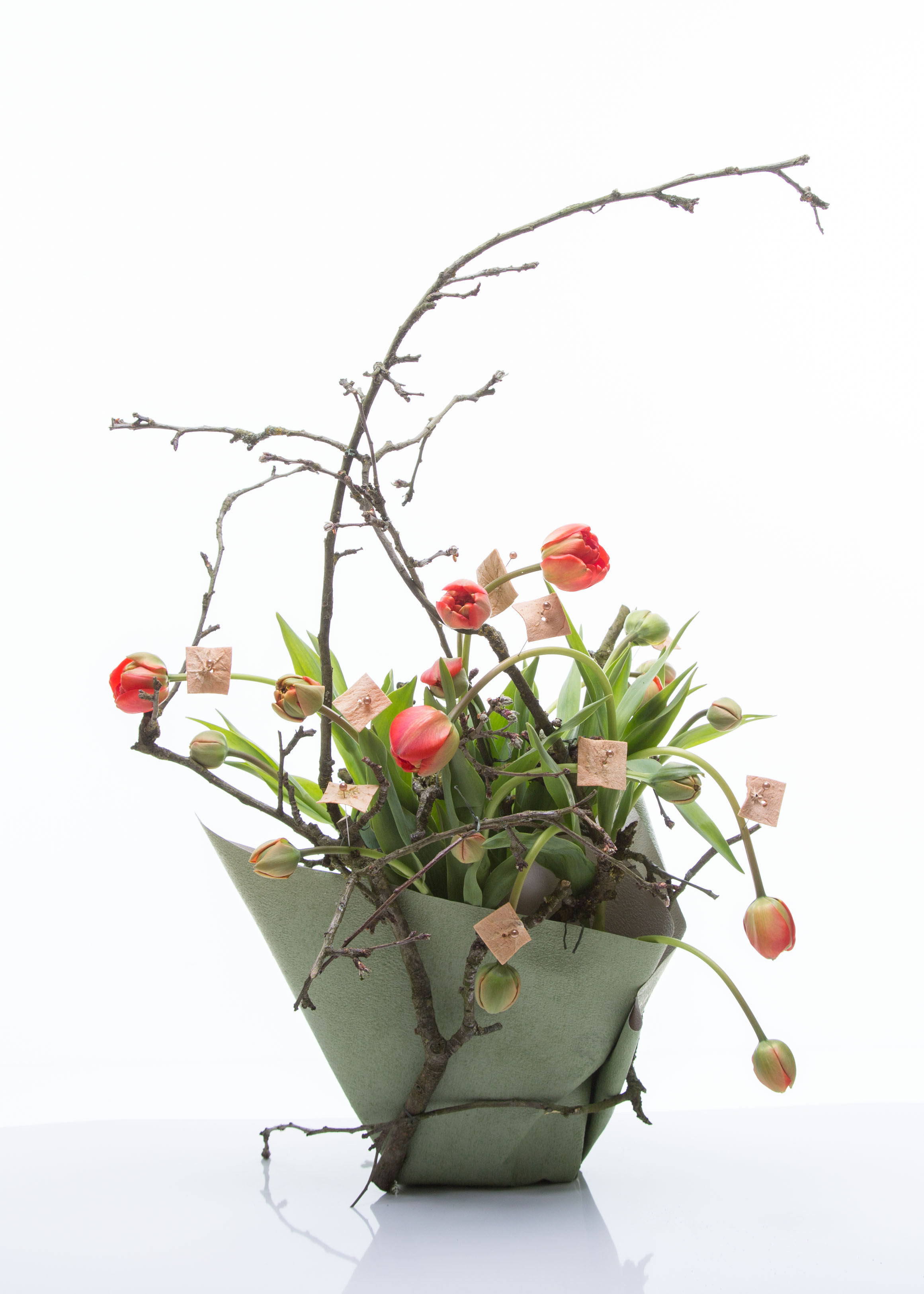 These peony-flowered tulips don't need a lot, except maybe for some support. The heavy flowers can rest their heads on the Prunus branches. A few little details and a dressed up vase complete this simple yet effective design.