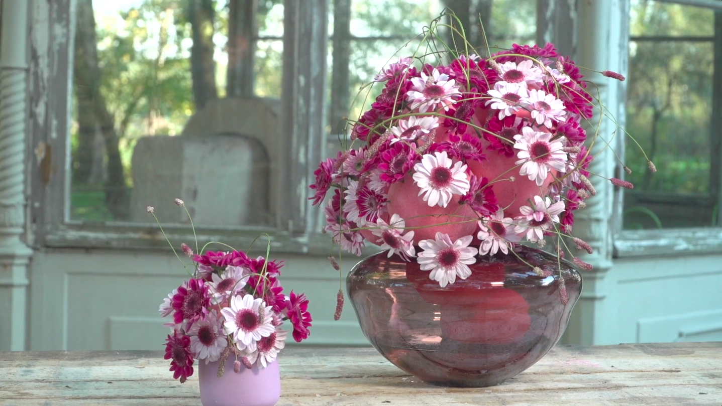 These sweet mums are called Stresa and Stresa Purple and were used by Kristel van Dijk to create a cute flower arrangement. Curious to see how she made this design? Watch the video tutorial!