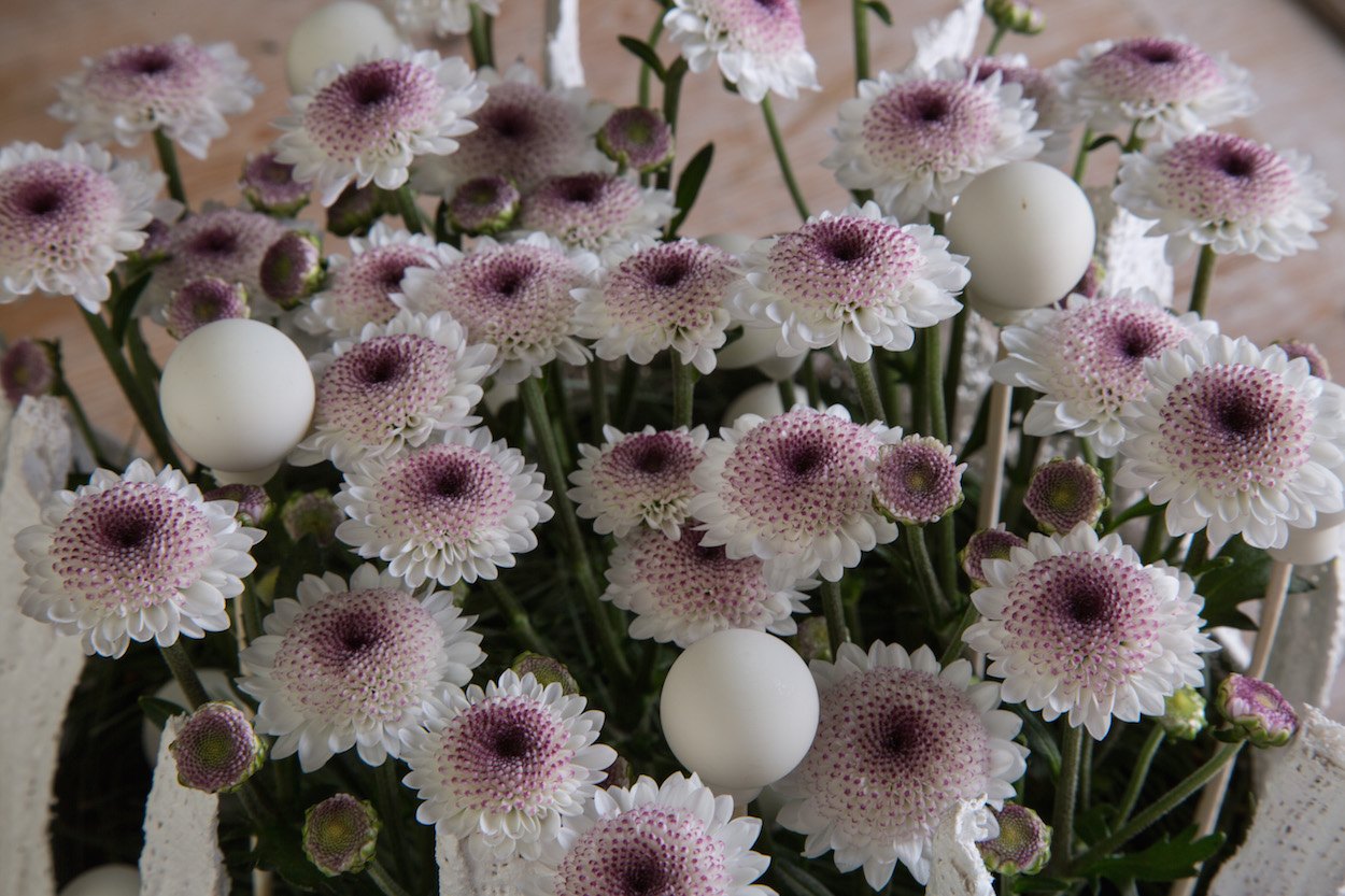 This christmas arrangement gives us the feeling of lots of polka dots. Happy Chrysanthemums with small christmas balls.