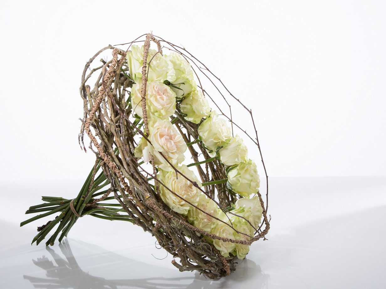 A romantic winter bouquet made by Roos van Unen with beautiful roses from Decofresh. The bouquet breathes space and elegance: a stunning present to give in the winter months. The natural materials create a serene and calm design. It is playfully dressed with some decorative wire which creates a nice effect. Beautiful design.
