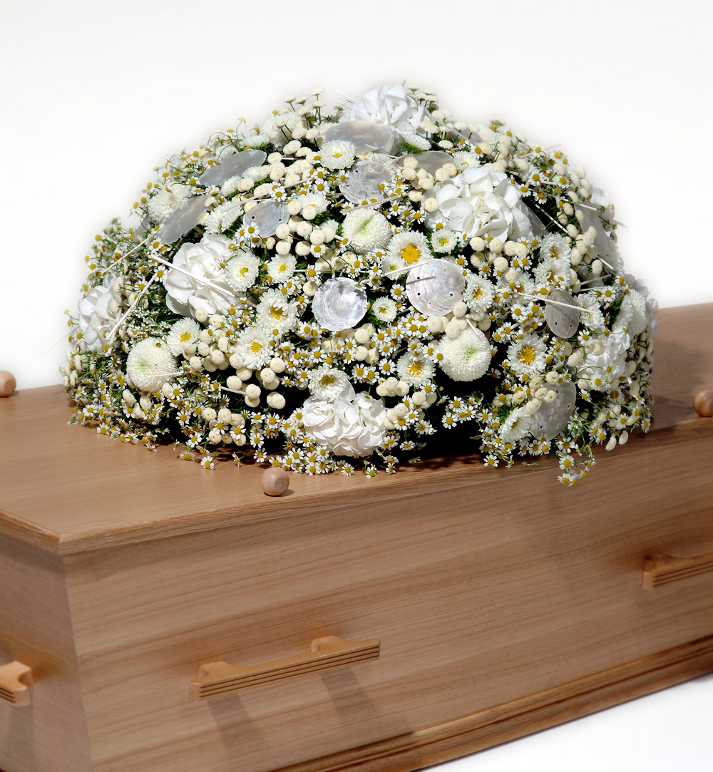 A round oval arrangement, exclusively white notes. The arrangement features Hydrangeas, Tanacetum and Chrysantemum and is accented with oyster shells and white salix twigs for a playful effect.