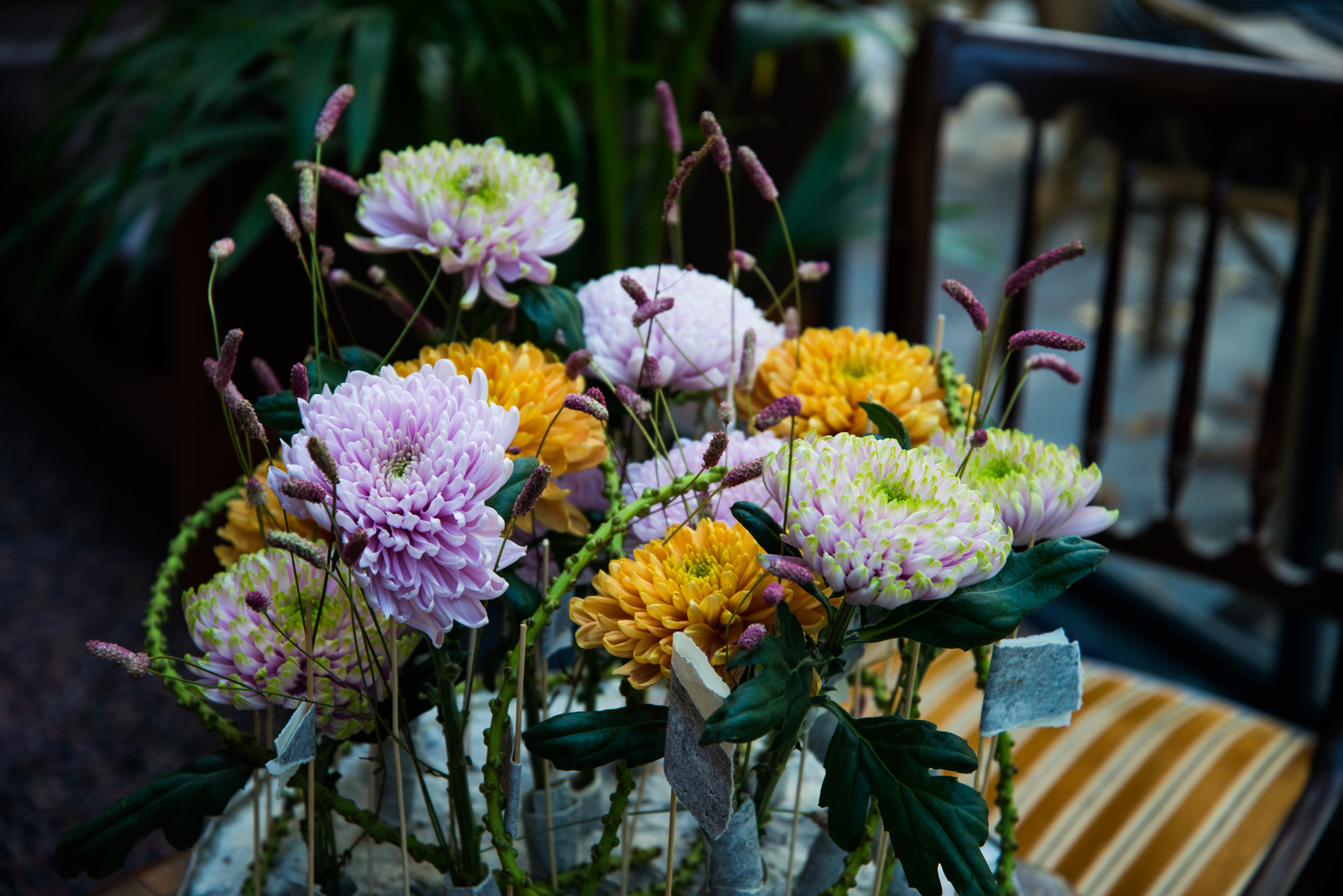 Kristel van Dijk places the beautiful varieties of the Rossano family from Deliflor Chrysanten on a pedestal. She chose to use three varieties from this 'family': 'Rossano', 'Rossano Charlotte' and 'Rossano Orange' and combined these warm colours with a base of cool tones. The result: a wonderful arrangement. This design can easily be adjusted to any other season if you change the materials (moss instead of wallpaper) and colours of the Chrysanthemums.