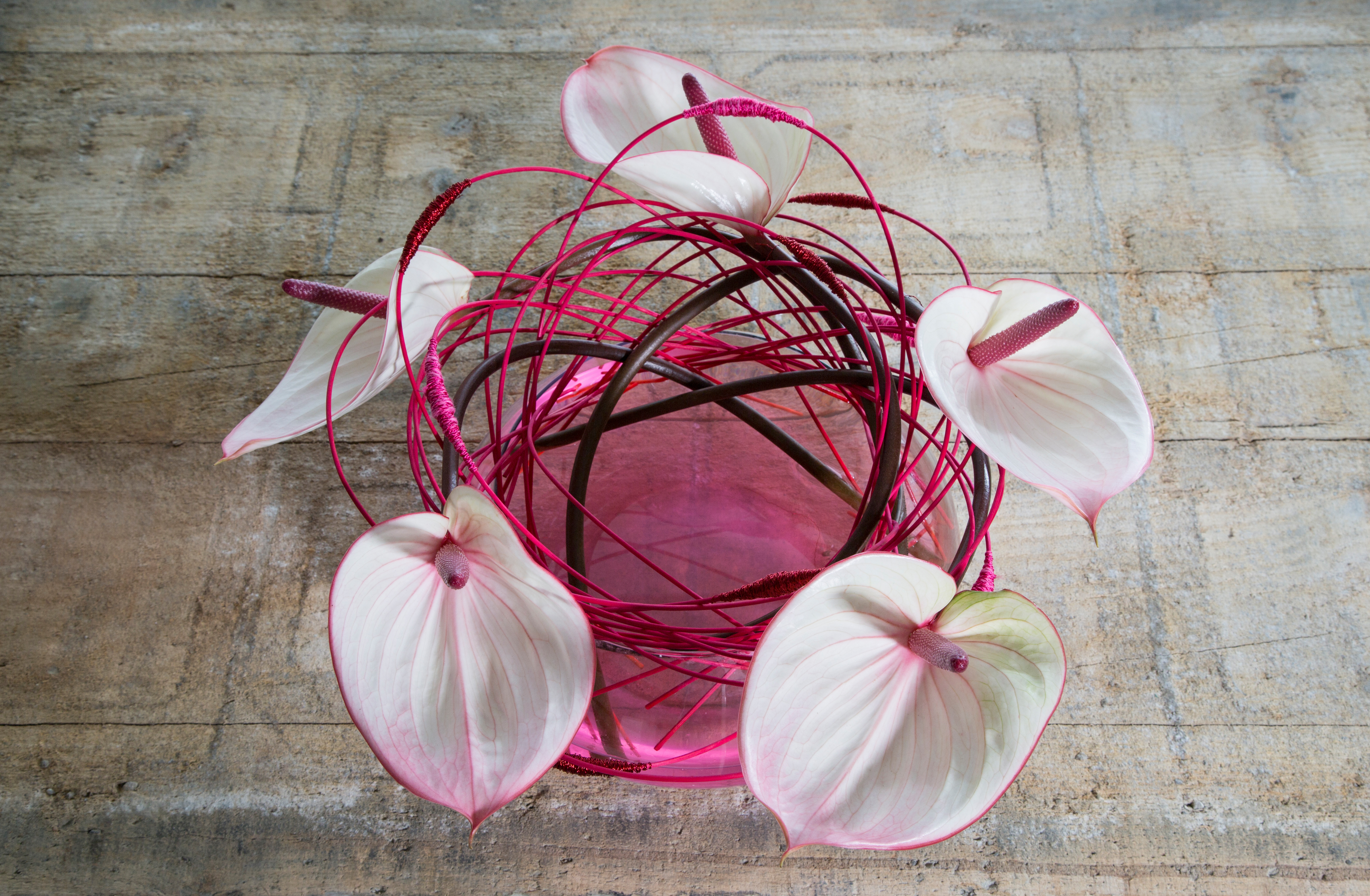 A simple bouquet idea by Kristel van Dijk with Anthuriums: this variety called 'Facetto' has a pretty splash of pink that is repeated in the pink wicker and pink pigment in the water. The wicker adds extra dimension and movement to the design and little wire details finish it off.