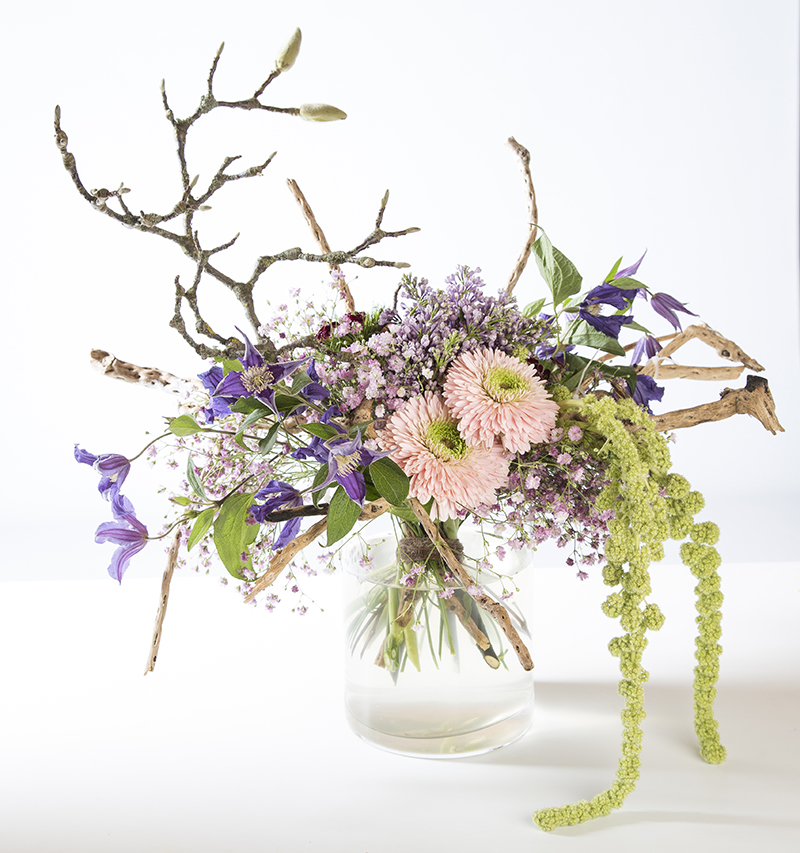 Exciting spring bouquet with Clematis, Magnolia, Lilac, Gypsophila, Gerbera and Amaranthus.