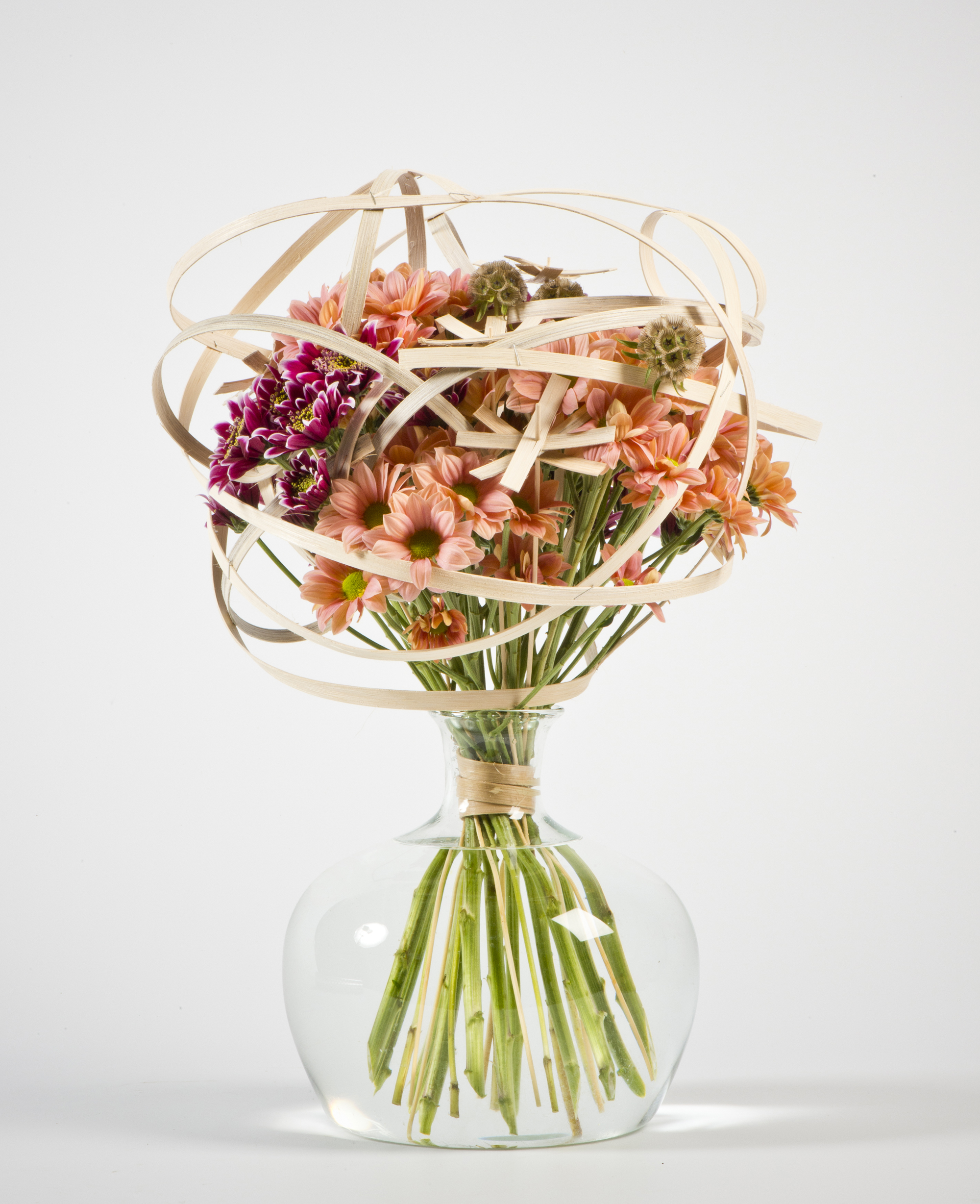Stunning varieties of Chrysanthemums, decorated with wood veneer strips. A beautiful Mother's Day bouquet!