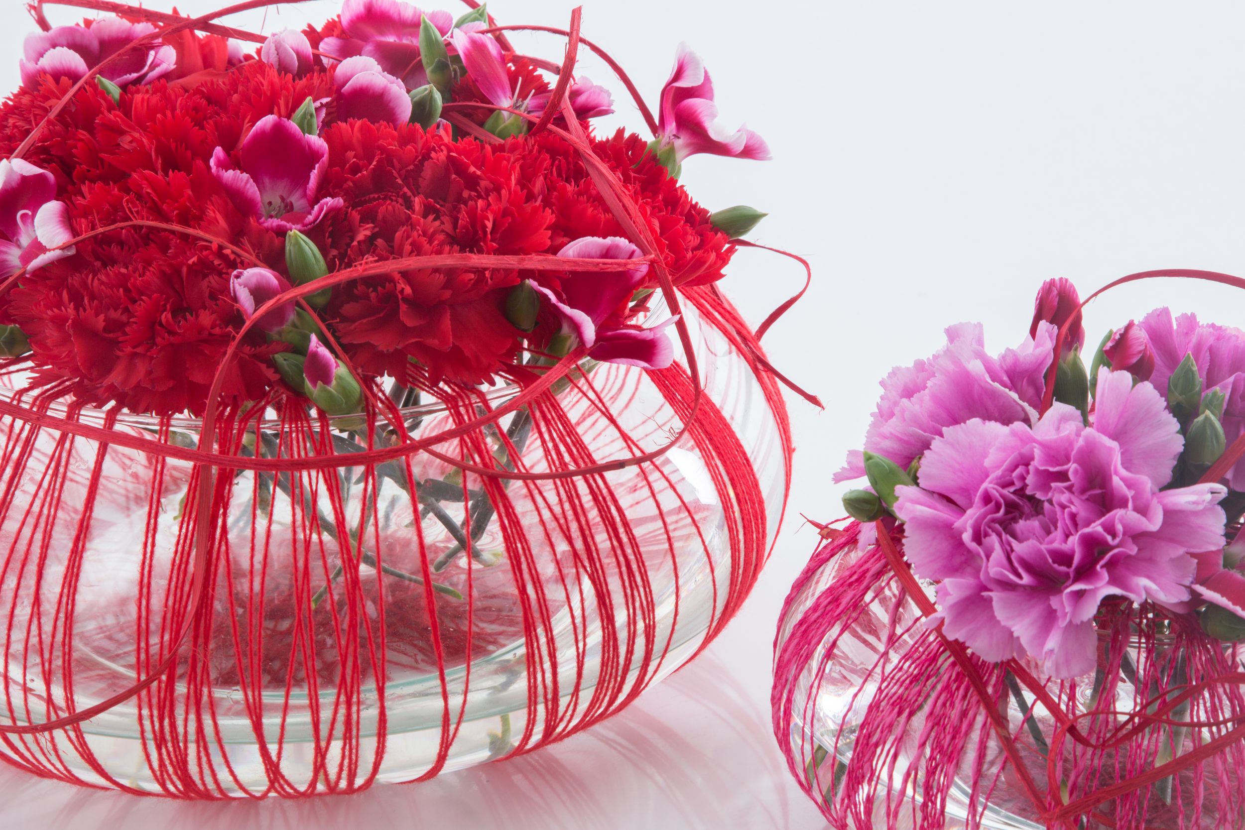 Roos van Unen has created a simple, but effective design with Dianthus. The different varieties, shapes and colours of the Dianthus create a beautiful collection together and are nicely combined with transparent bowls. The decorative brightly-coloured threads create a playful and slightly romantic effect. It is a perfect and subtle gift.