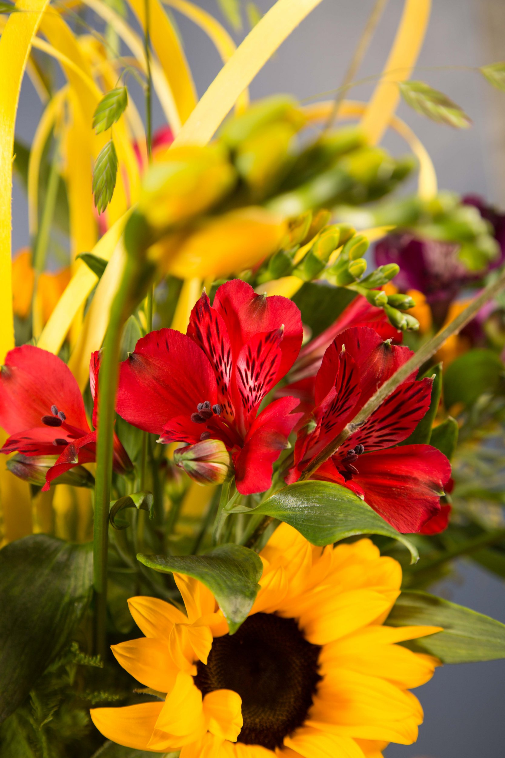 The florists from the Dutch flower shop 'De Bloemenvink' created this summery Alstroemeria bouquet. This bouquet shows which part the Alstroemeria can play in a bouquet: a colourful and exuberant surprise which gets prettier by the day. Combined with yellow flowers and materials like sunflowers, Mimosa, Craspedia, playful grasses and rotan make the three different varieties of Alstroemeria's pop! The Alstroemeria symbolises friendship, which makes this flower perfect to use in joyful bouquets.
