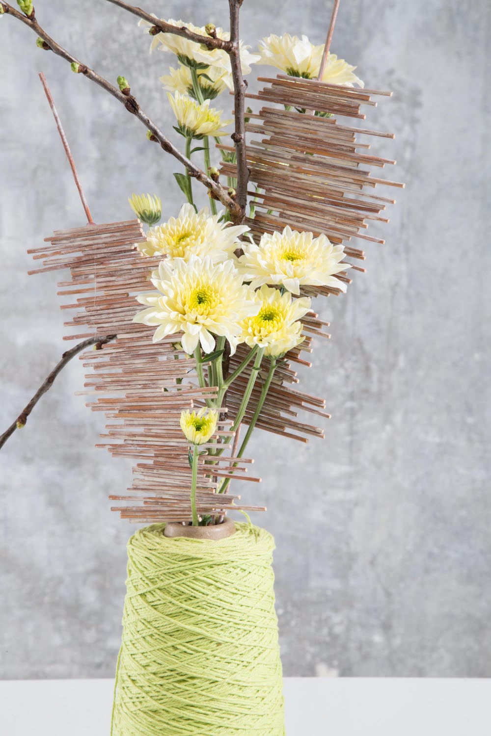 It's almost art, still this is quite easy to make. Two stems of Chrysanthemum 'Vanilla Sorbet', a blossom branch, and some small sticks glued together. They're put into a glass tube, concealed in this yarn bobbin. By using these surprising materials, the Chrysanthemum gets a contemporary look and feel!