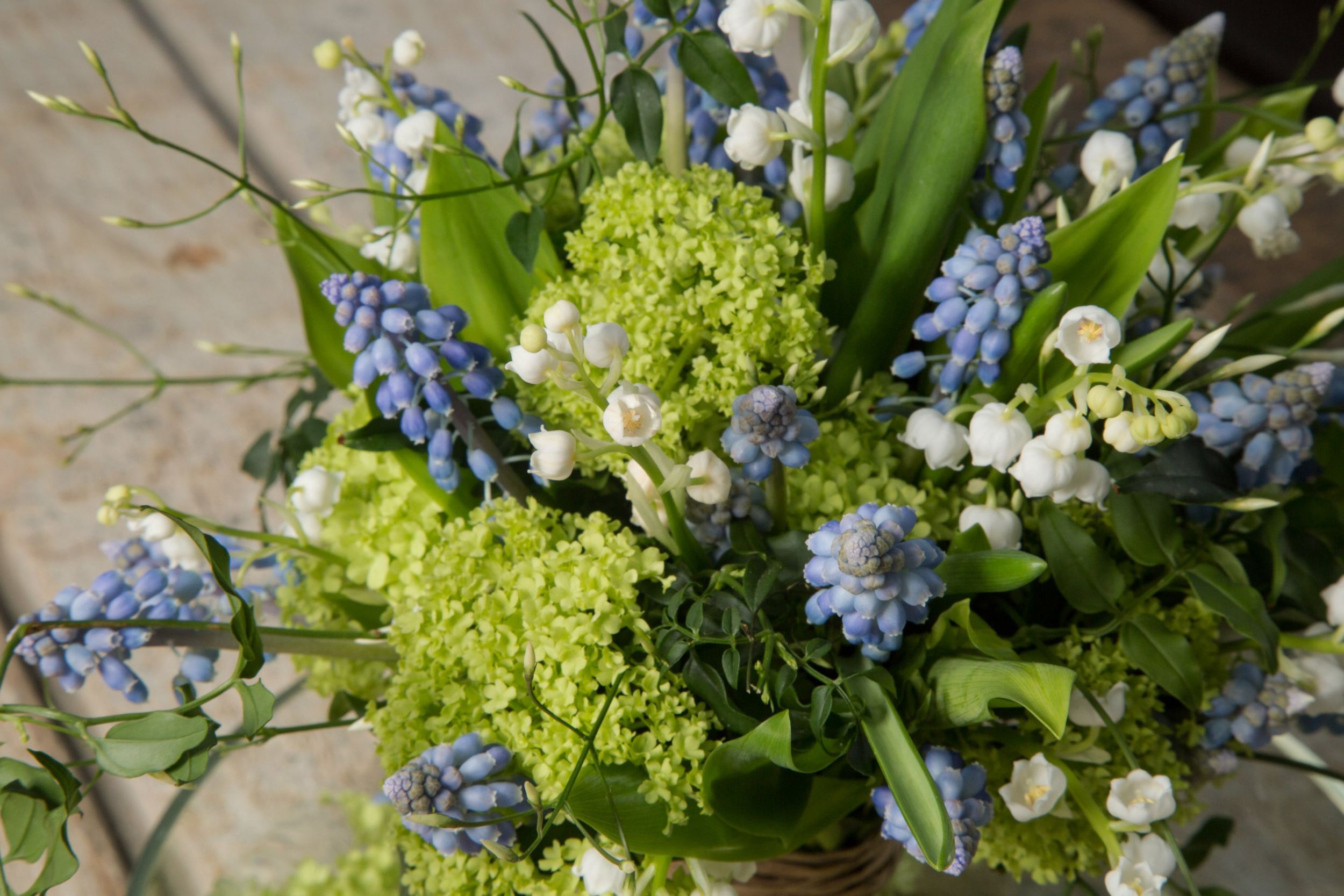 Combine Muscari, lily-of-the-valley, Viburnum opulus and Jasmine together and you end up with a super sweet scented spring bouquet. Idea by Dutch floral designer Inge Quint. Watch her video tutorial!
