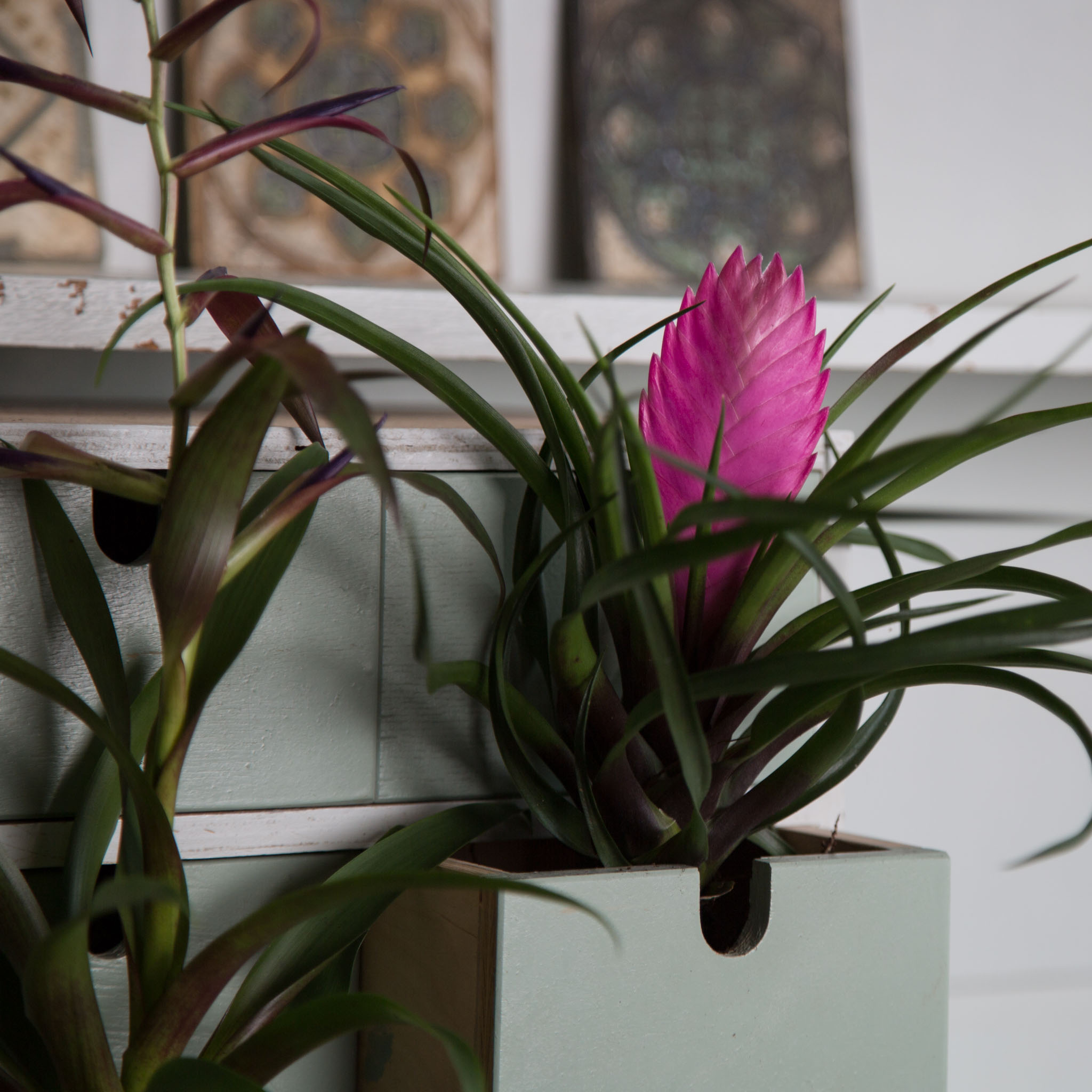 The bright pink bracts of the Tillandsia will surprise you with deep purple flowers. A cool plant to color the smaller spaces in your home!
