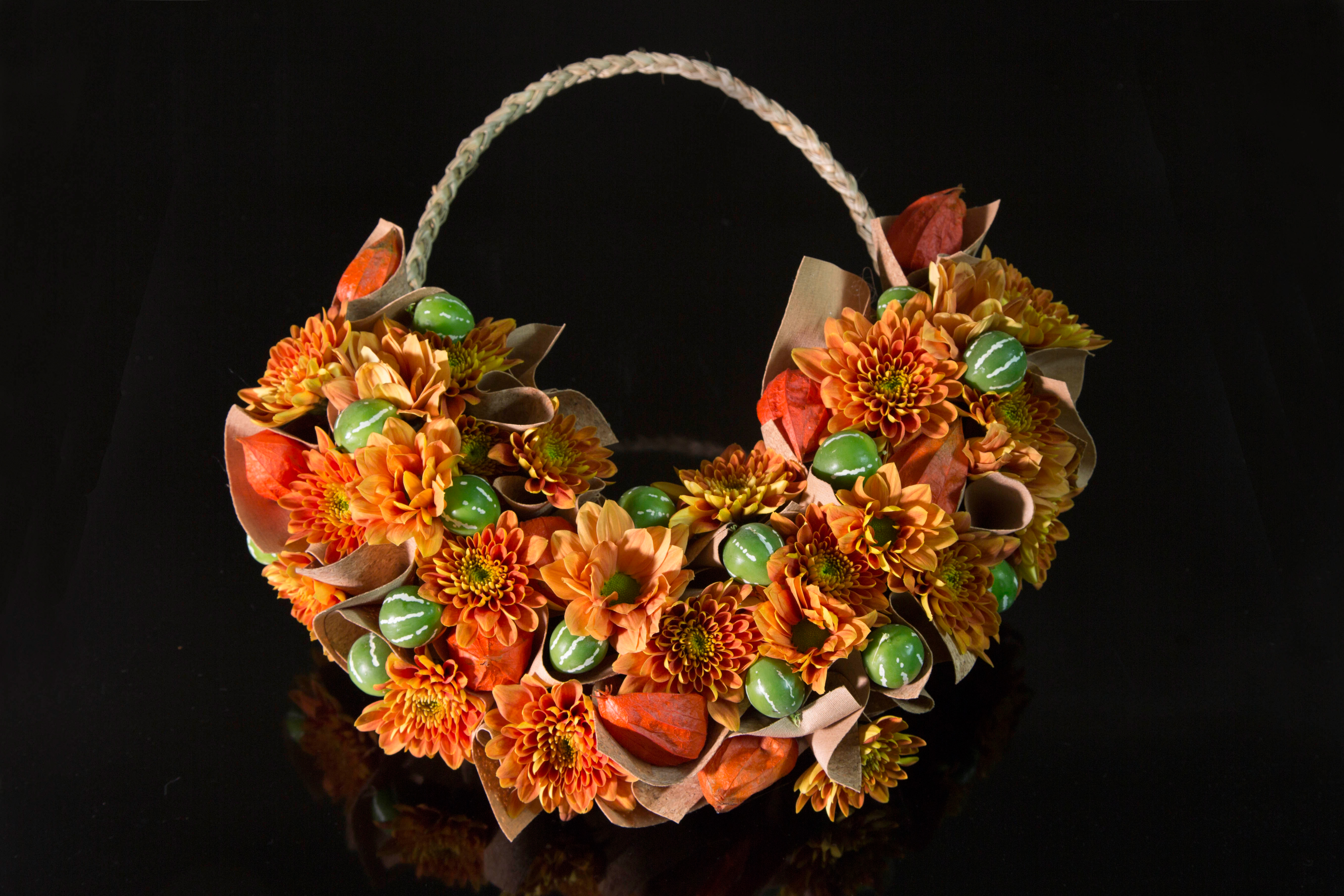 Urn decoration by Pim van den Akker with Chrysanthemums 'Doria Orange' and 'Grand Orange', Diplocyclos, Physalis and thin cork sheets.