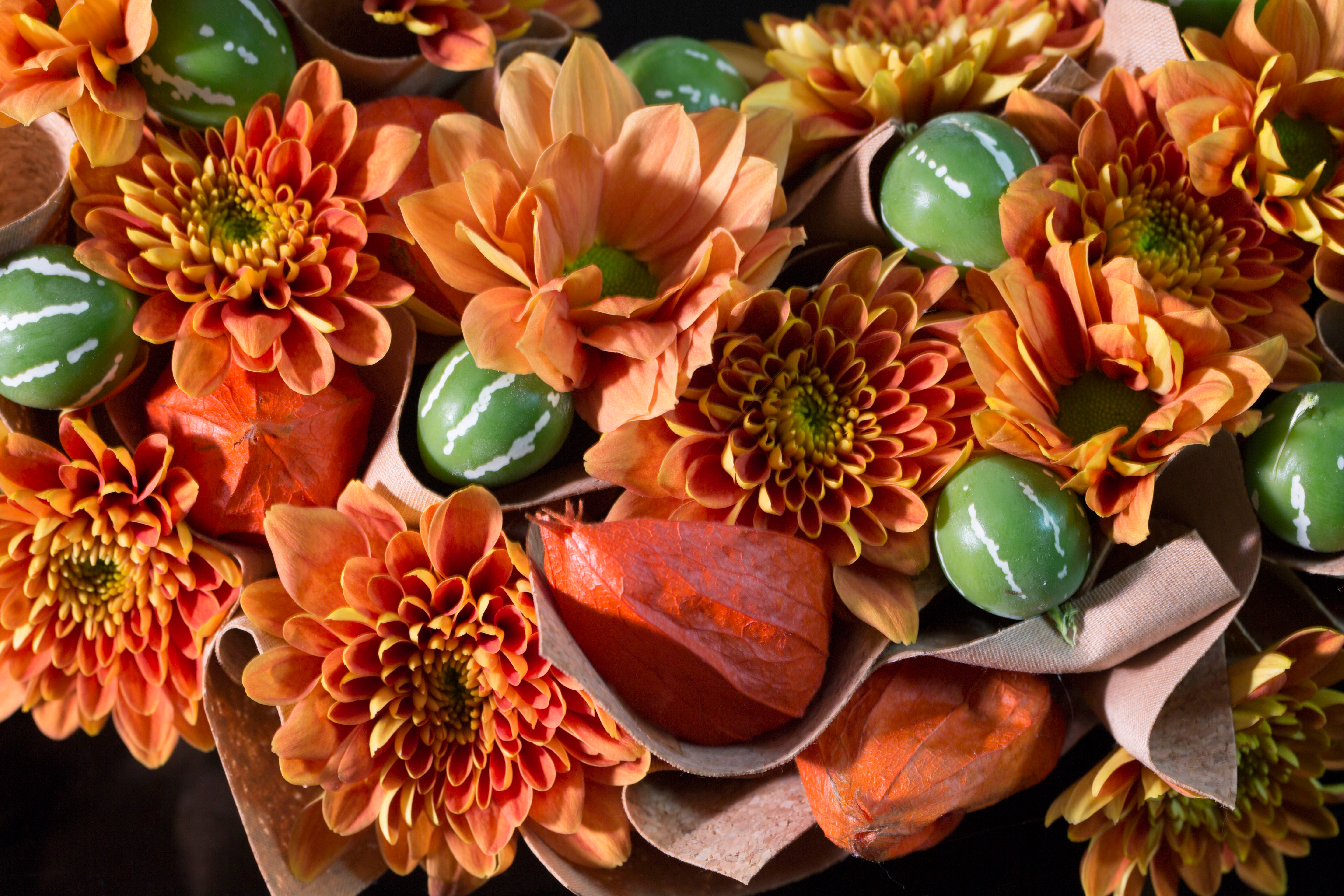 Close up of the urn decoration by Pim van den Akker with Chrysanthemums 'Doria Orange' and 'Grand Orange', Diplocyclos, Physalis and thin cork sheets.