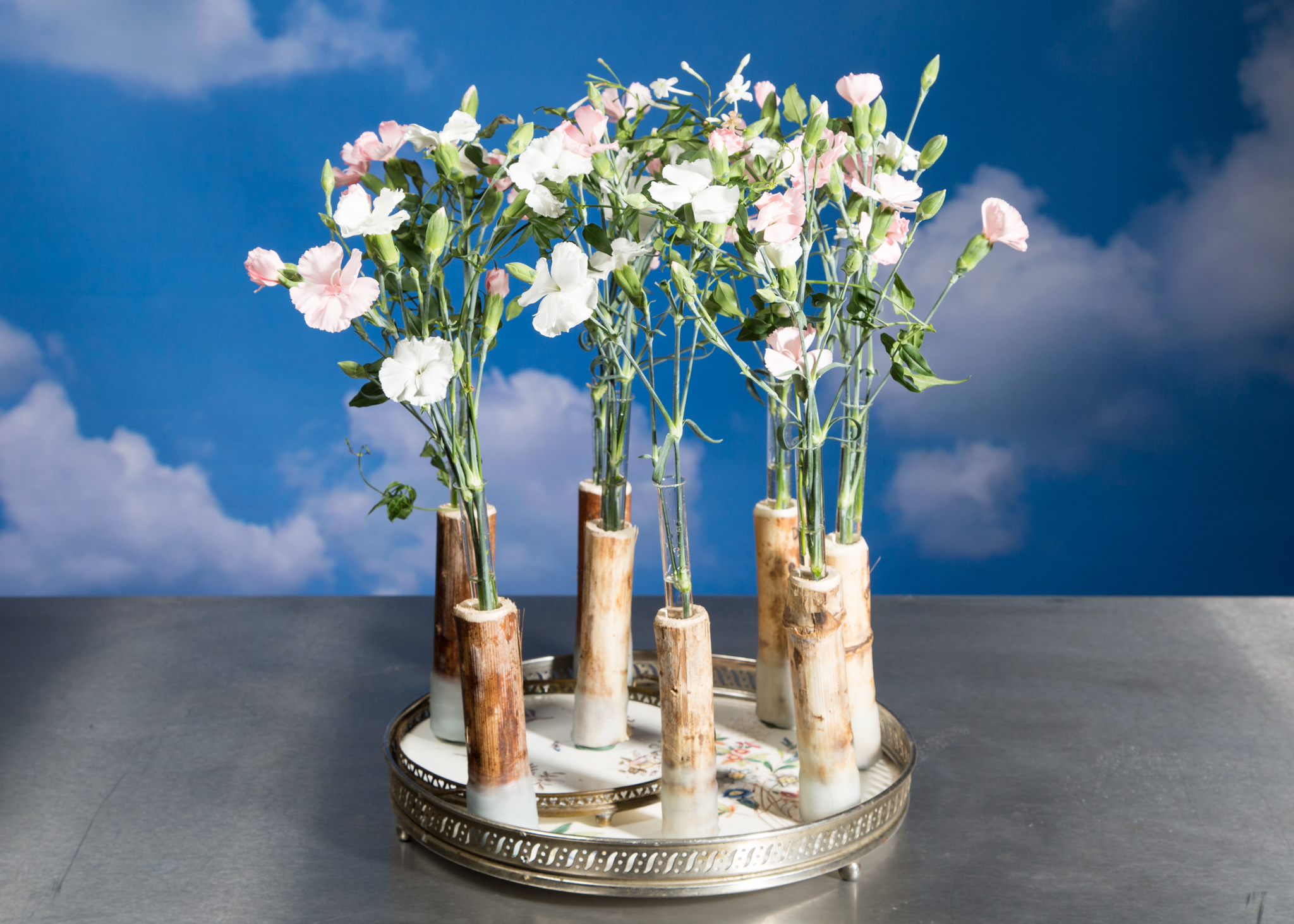 A pastel colored design on a vintage tray... Pim van den Akker gives something pretty from the old times a modern twist special for the vintage mama! He is using white spray carnations from HilverdaKooij.
