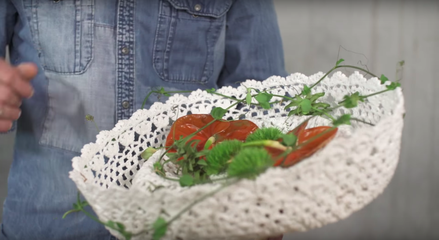 Example of a wedding bouquet with Anthuriums. These wonderful cut Anthuriums are called 'Terrasol' and are stunning for fall themed weddings. An extraordinary flower such as this one, should be at the center of attention. That's why Pim van den Akker only uses some green flowers and grasses. The crochet base gives it that all important romantic feel.
