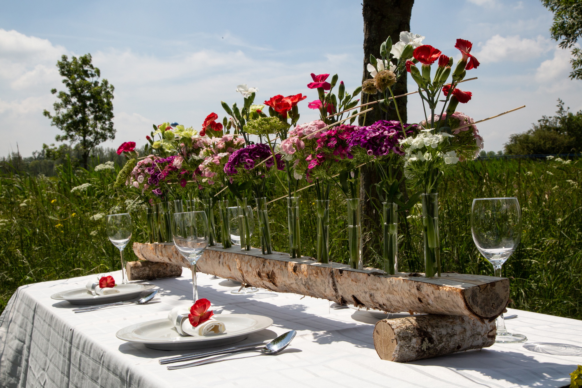 The Sparkz carnation varieties from Hilverdakooij are perfect for colourful and long-lasting bridal decorations such as this festive wedding table decoration. They look great in this base made of wood and tubes filled with various colourful Breanthus and Solomio varieties and other flowers such as Scabiosa.