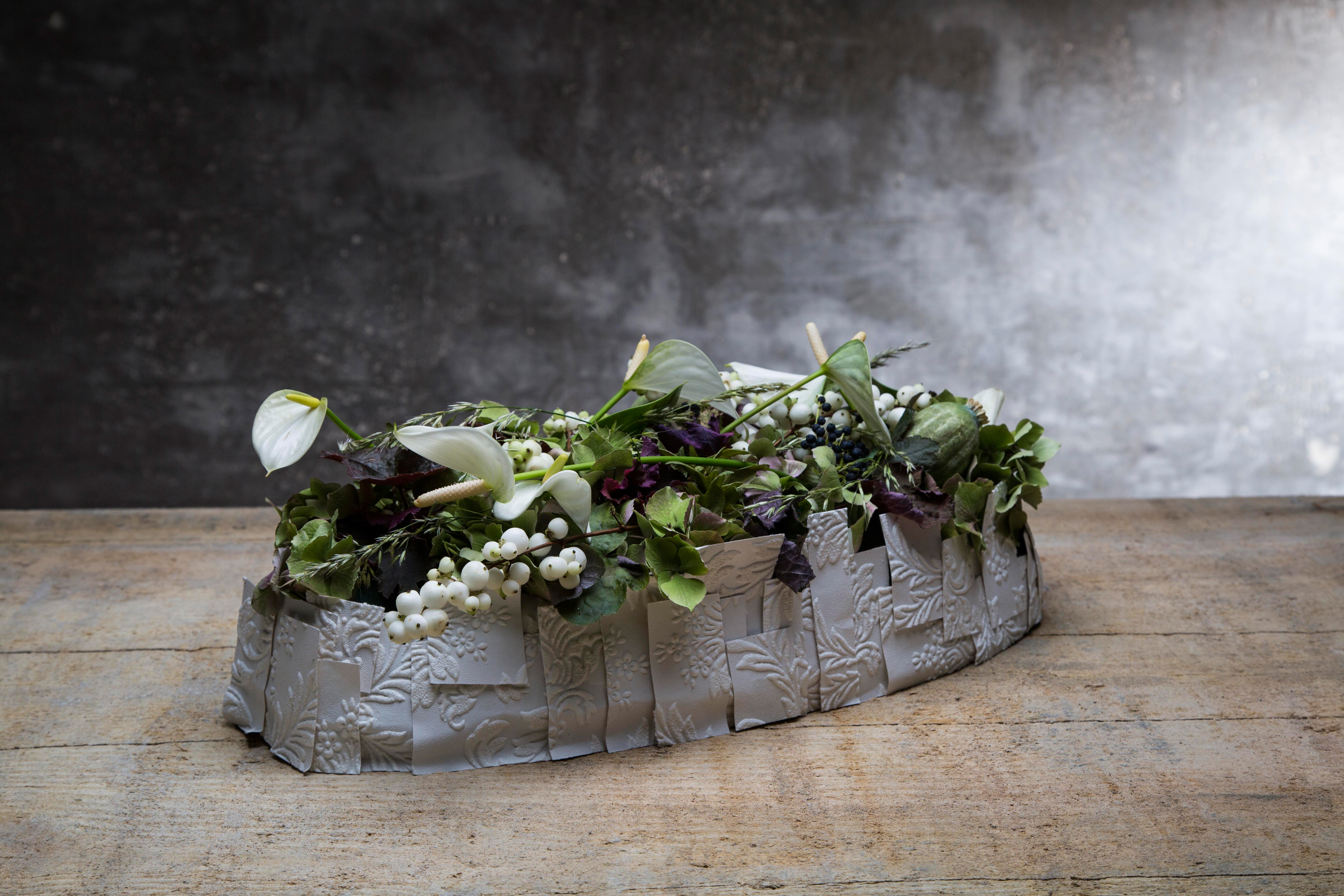 Floral designer Bea Beroy created this white funeral flower design with Adios® White anthuriums by Fuerte Planta together with hydrangea, poppy seed boxes and Symphoricarpos berries.