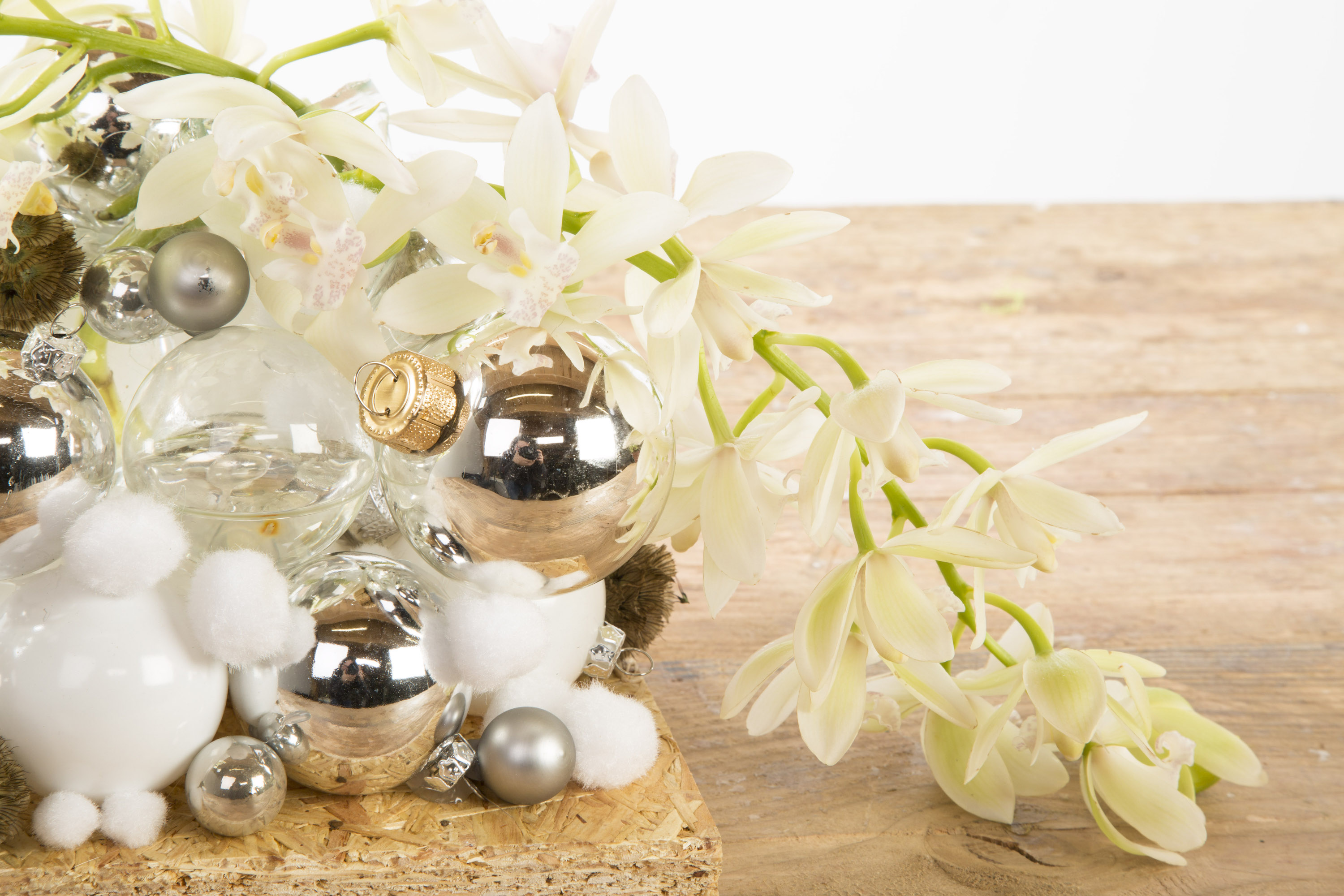 Nelleke Bontje shares an idea for a Christmas arrangement made out of Christmas balls and glass vases that is flowered with a beautiful 'Cascade Cymbidium' orchid.