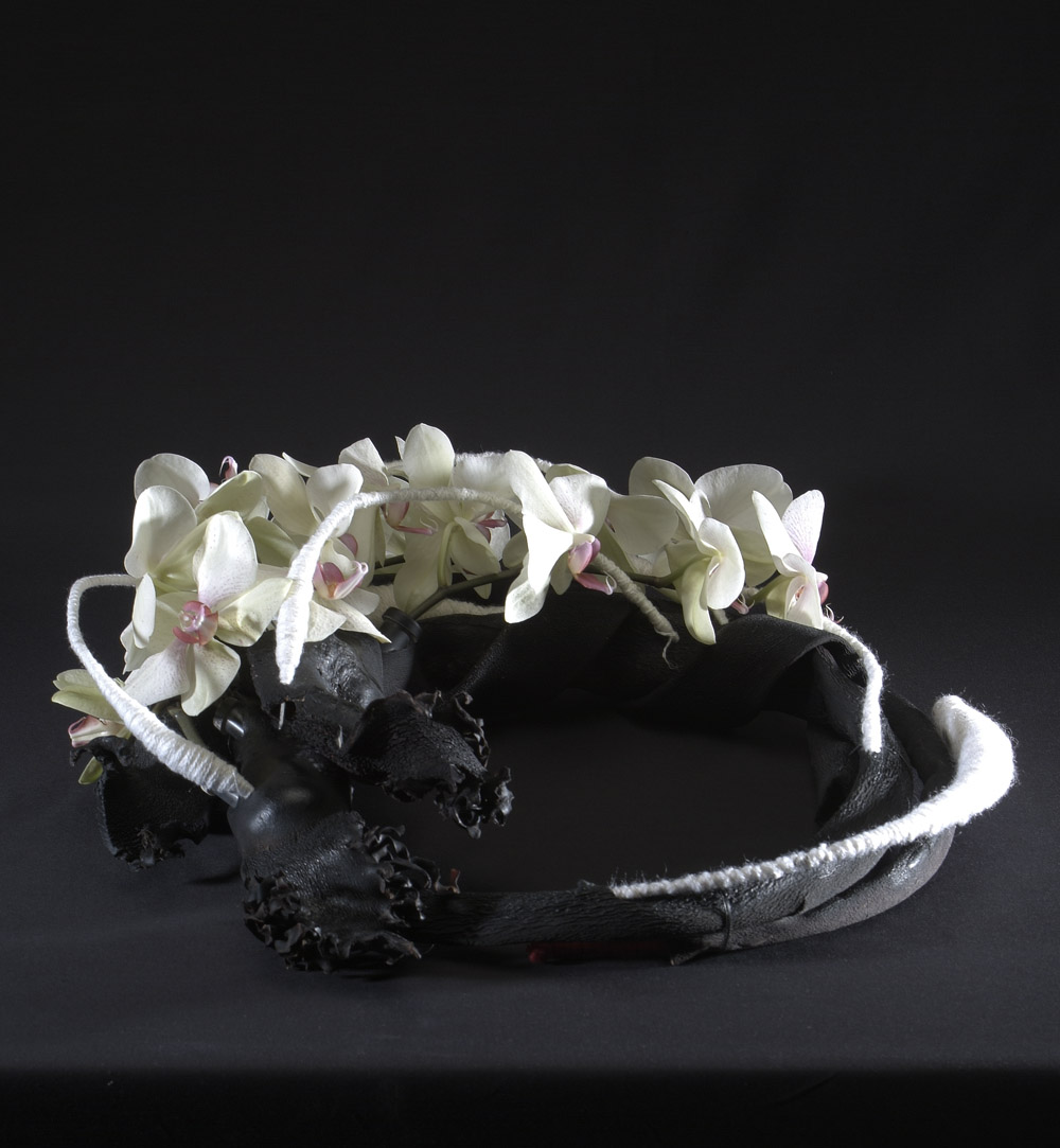 Het contrast van de rondgebogen kelpen en de onschuld van de witte Phalaenopsis is zeer treffend bij deze zwart/witte krans.