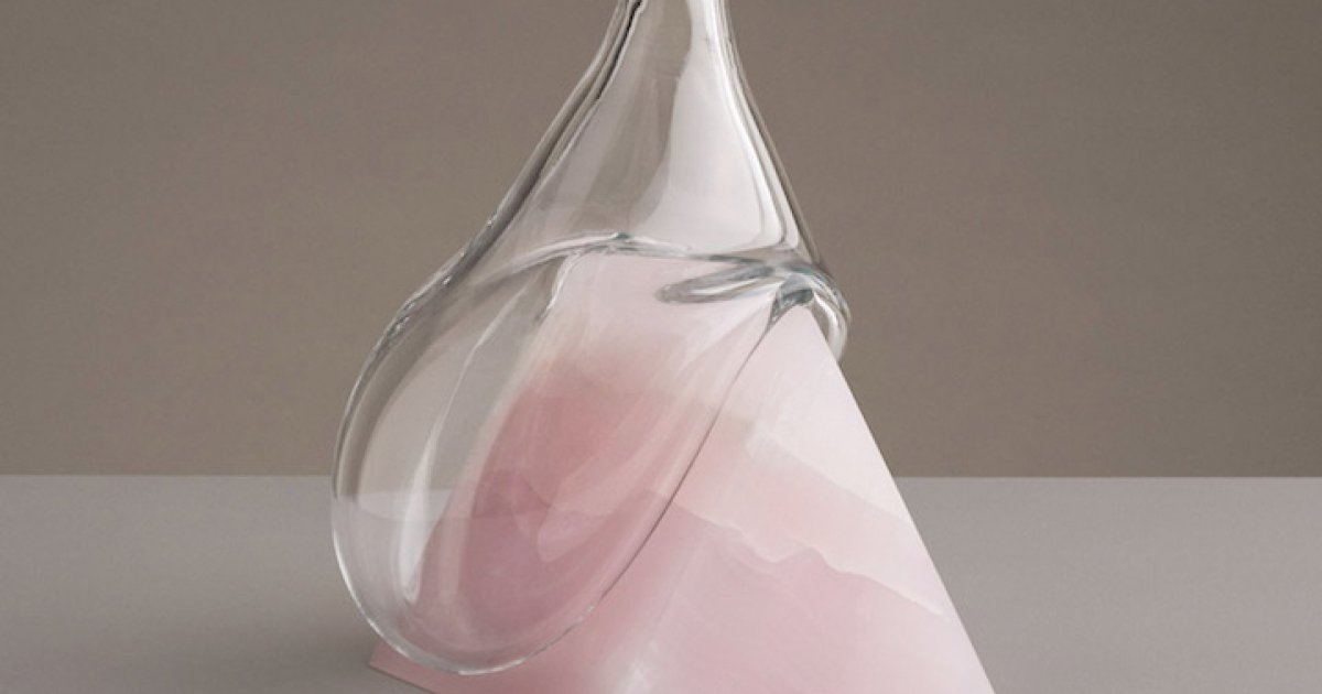 In his Indefinite Vases series, designer Erik Olovsson of Studio E.O juxtaposes smooth, rounded vessels of hand-blown glass against clear-cut geometric slabs of patterned stone. In some of the pieces, the glass appears draped or melted over angled edges of granite and onyx; in others, the bulb-shaped containers sit perched in open slices of marble.